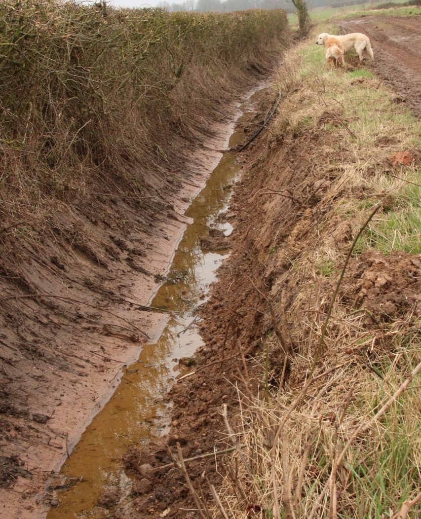 Despite an improvement in the weather, the paths remain muddy, a sign that the fields are sodden. In consequence the ditches in the fields have been dredged, a tractor-mounted bucket scooping out the silt and weed growth that gradually fill the ditches over time. Field drains, flexible perforated pipes buried below plough-depth, allow excess water from the soil to run into these ditched, and this won’t happen if the diches are full of silt, and any water that does make its way into a ditch wont flow away. The ditch dredging will be beneficial in future wet seasons, but at the moment the result is muddy paths, thanks to tractor tyres, and piles of material pulled out of the ditches.