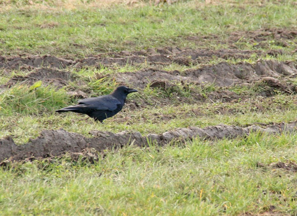 Nature is active in the midst of this agro-industry. A skylark sings enthusiastically and continuously high above the fields. I spot 2 large male hares chasing across a field just a second before Sam does, and I am able to stop him from running after them. But he bides his time, and when we get closer to the gateway into the field he sprints off, despite the hares having long gone. He doesn’t run far before returning back to me. Back at the gate onto the Lane the ground has been churned up by the tractor and trailer delivering the cow dung, and a crow takes advantage of the disturbed mud to seek out worms and other grubs.