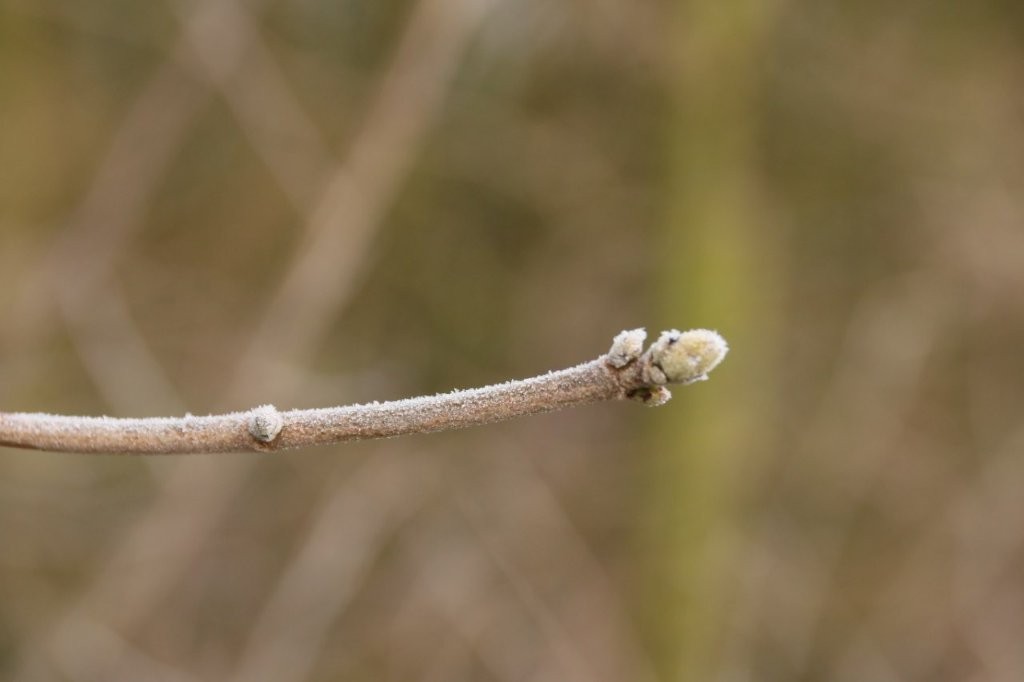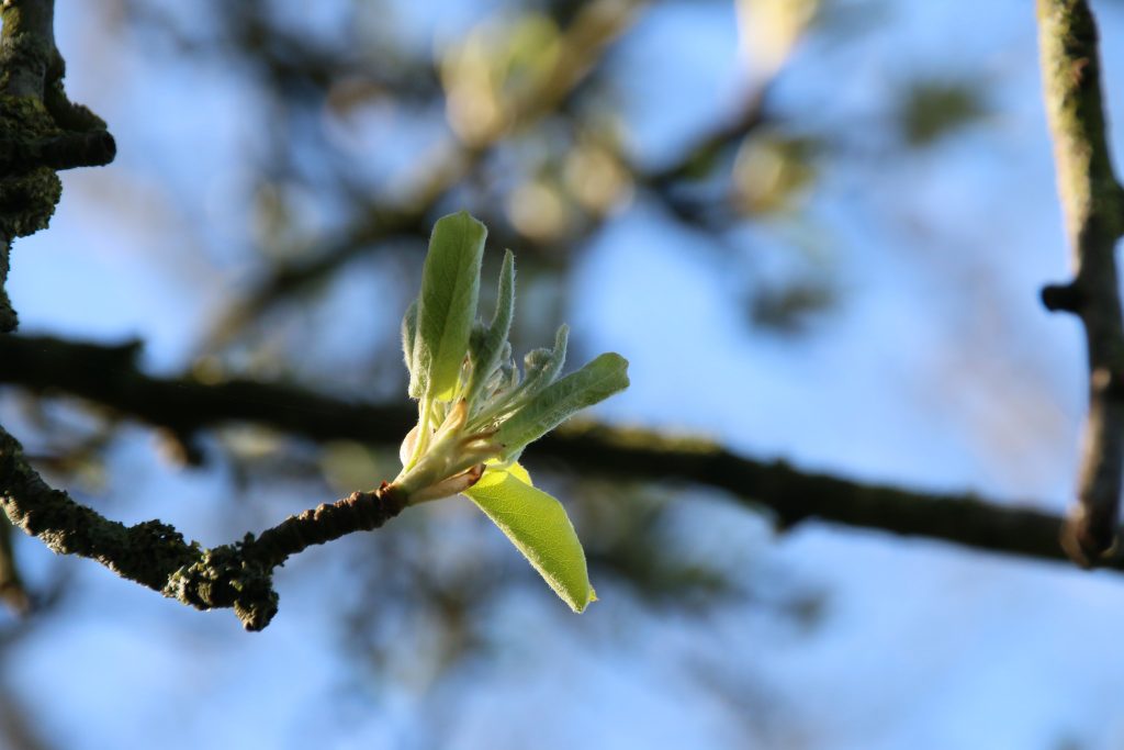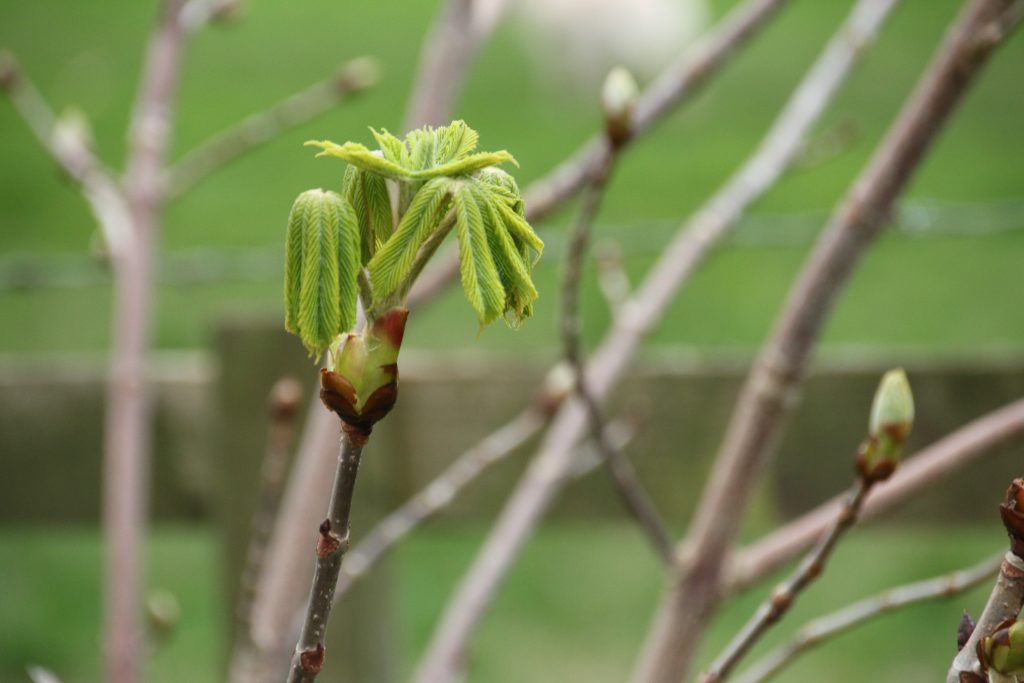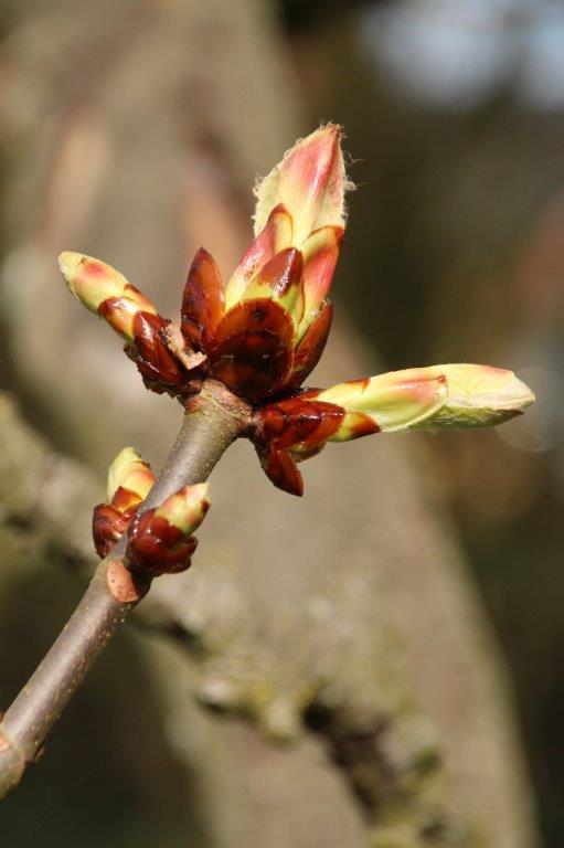 We cross the road to enter the Glebe. We often meet fellow dog walkers from the village here, and the dogs play together, but today we have the field to ourselves. The more mature trees are horse chestnuts, conker trees, with “sticky buds” – the buds are sticky to touch, which helps to prevent damage by small insects which get trapped on the gluey surface of the buds.
