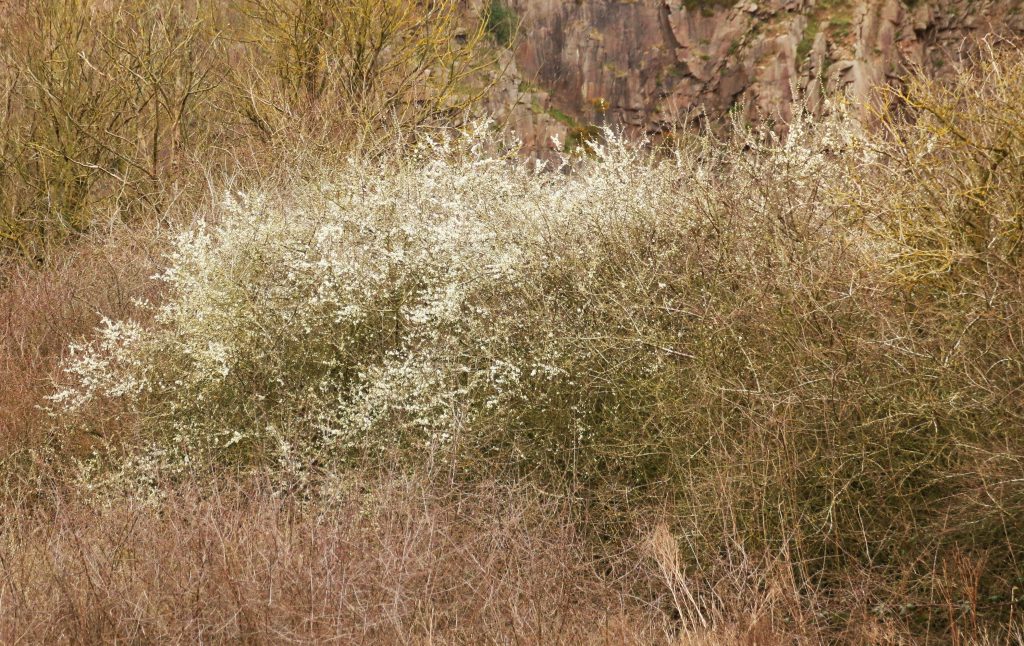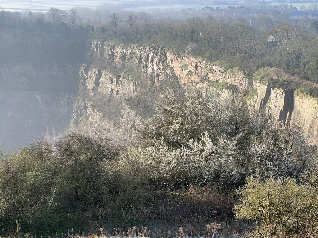 From the top of the Hill mist could be seen rising from the cool depths of the quarry and dissipating as it emerged into relatively warm sunshine. Blackthorn bushes at the quarry edge are almost in full bloom. Hawthorn leaves emerge before blossom, whereas Blackthorn blossoms before coming into leaf.