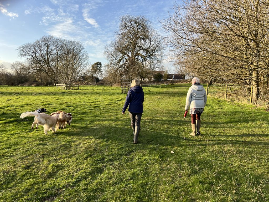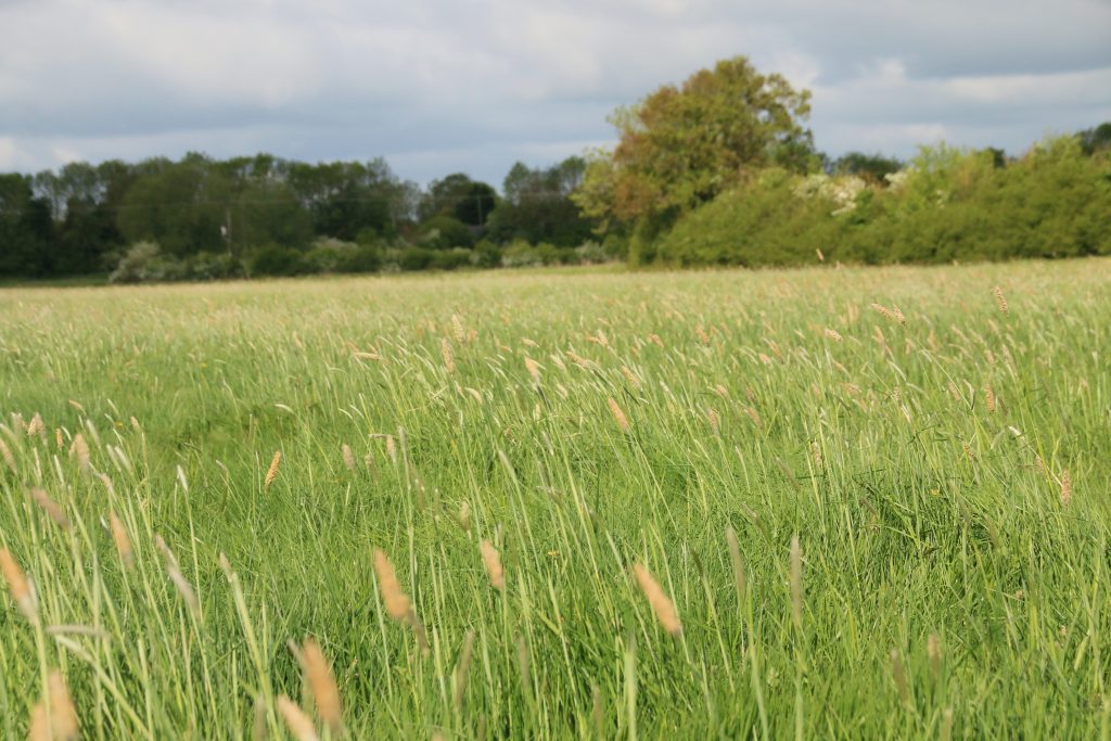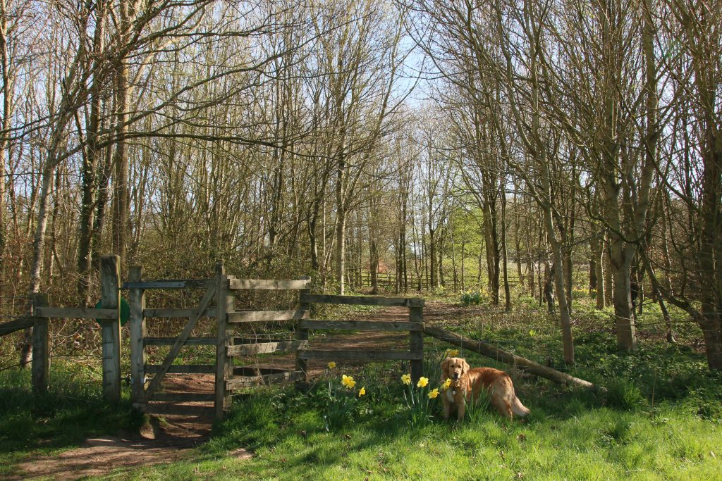 The land behind us is owned by a large building company, a “land-bank” investment rather than potential building land, and managed by a farm manager, who seems to farm responsibly. The herbicides will meet all regulations. Nevertheless I wouldn’t like the dogs to walk over recently sprayed grass. There is the potential for some windblown spray to travel onto grass bordering the cultivated soil, and in any case the dogs don’t know the difference between the field-edge grassland and cultivated crops, at this time of the year the same height as grass. The dogs may occasionally wander onto the crop briefly before being recalled. After consultation with our dog walking friends, we decide to avoid the footpath along the field edge, and instead follow the path down to the village, crossing the road to ” Croft Glebe”, enclosed and environmentally managed by the Woodland Trust, and where the dogs can all play and run free.