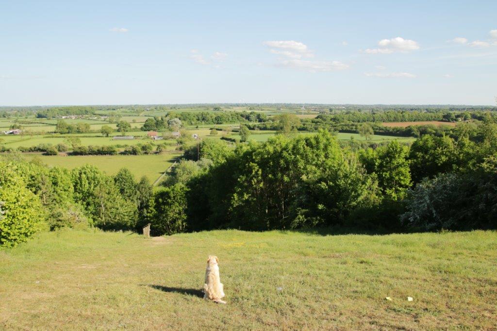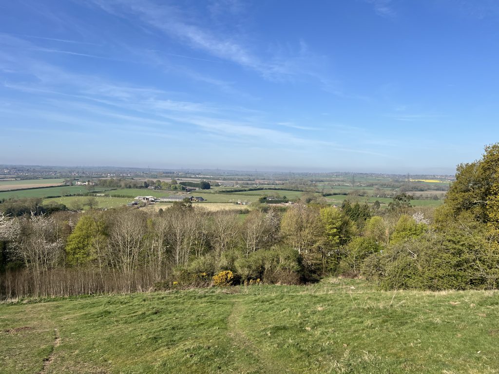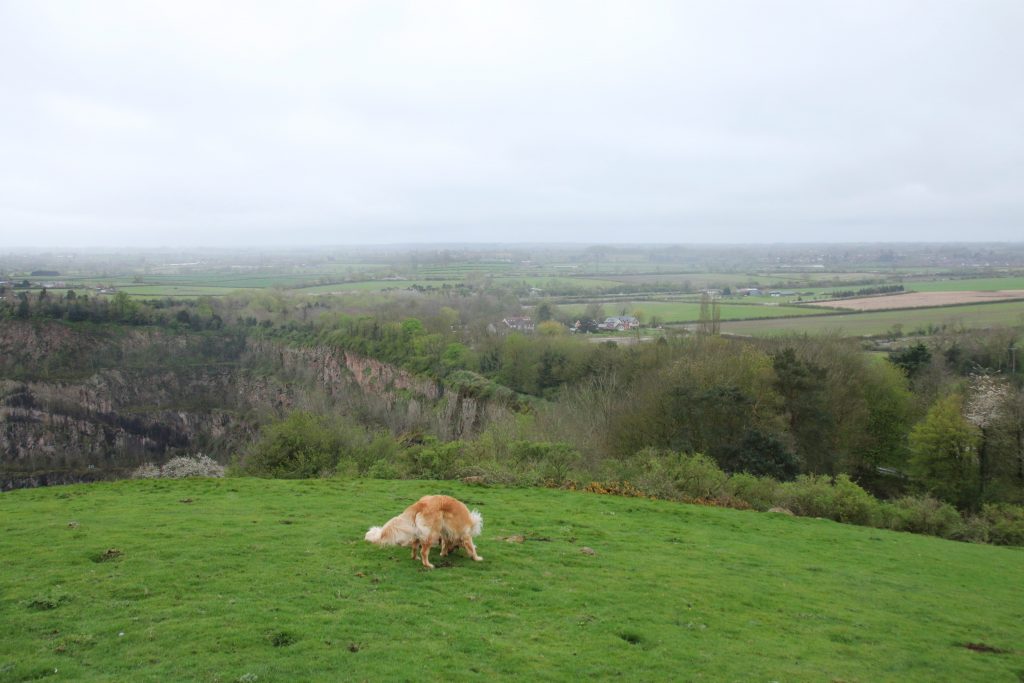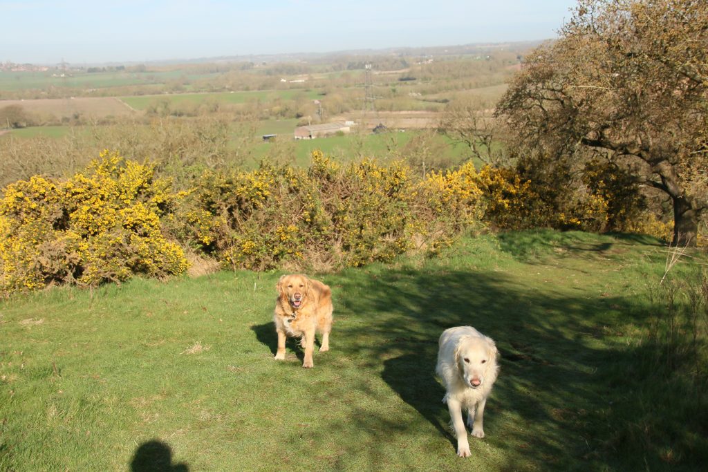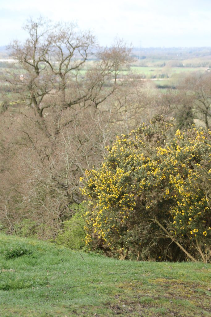 After a dry couple of weeks, the season is delivering April Showers. As we ascend Croft Hill, as Sam waits for me in front of profuse yellow-flowering gorse, the view is of the Leicestershire countryside basking under high cloud and blue skies.