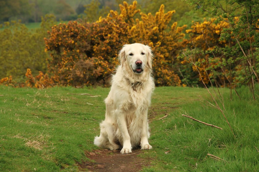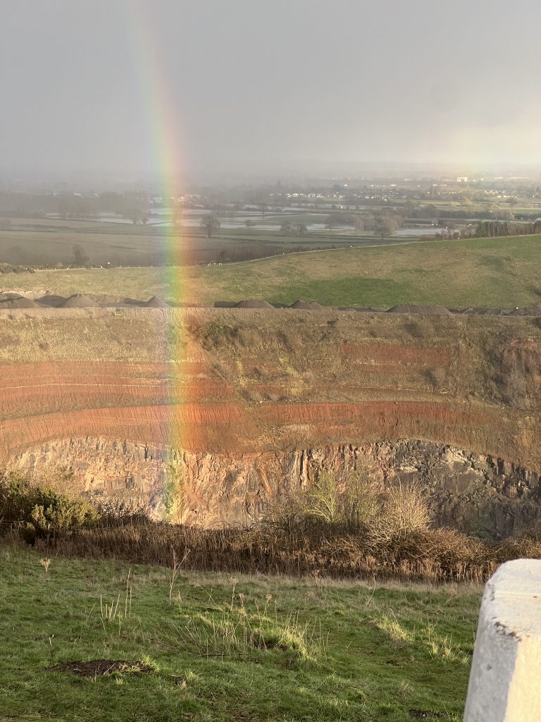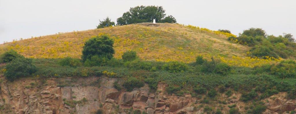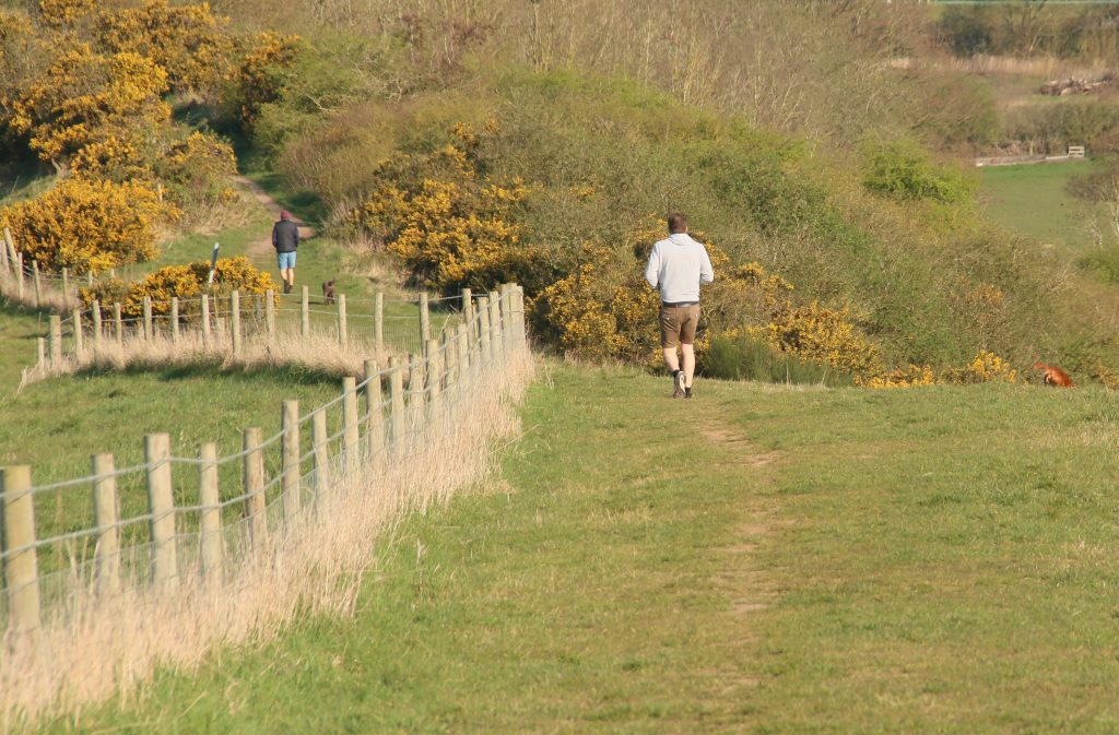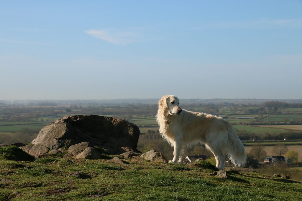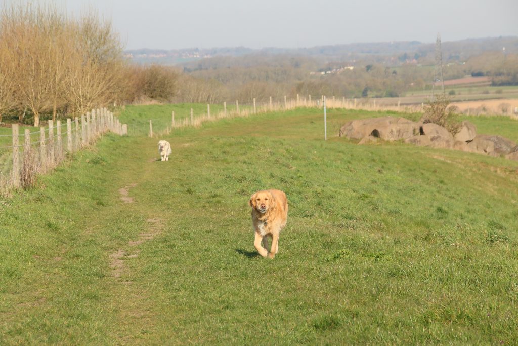 After a dry couple of weeks, the season is delivering April Showers. As we ascend Croft Hill, as Sam waits for me in front of profuse yellow-flowering gorse, the view is of the Leicestershire countryside basking under high cloud and blue skies.