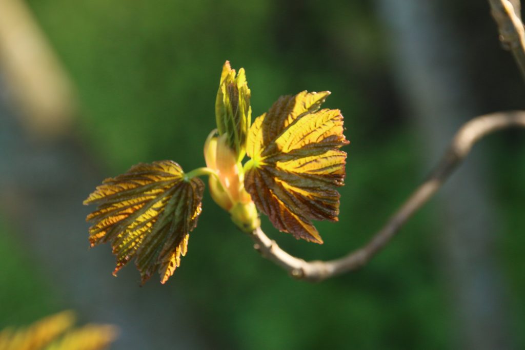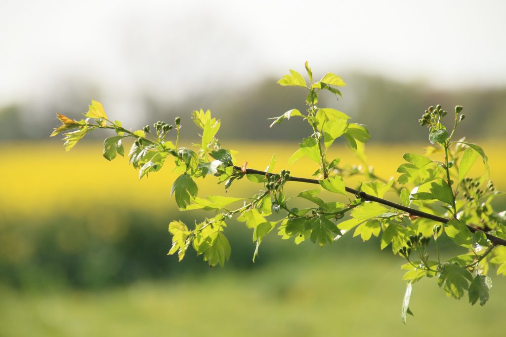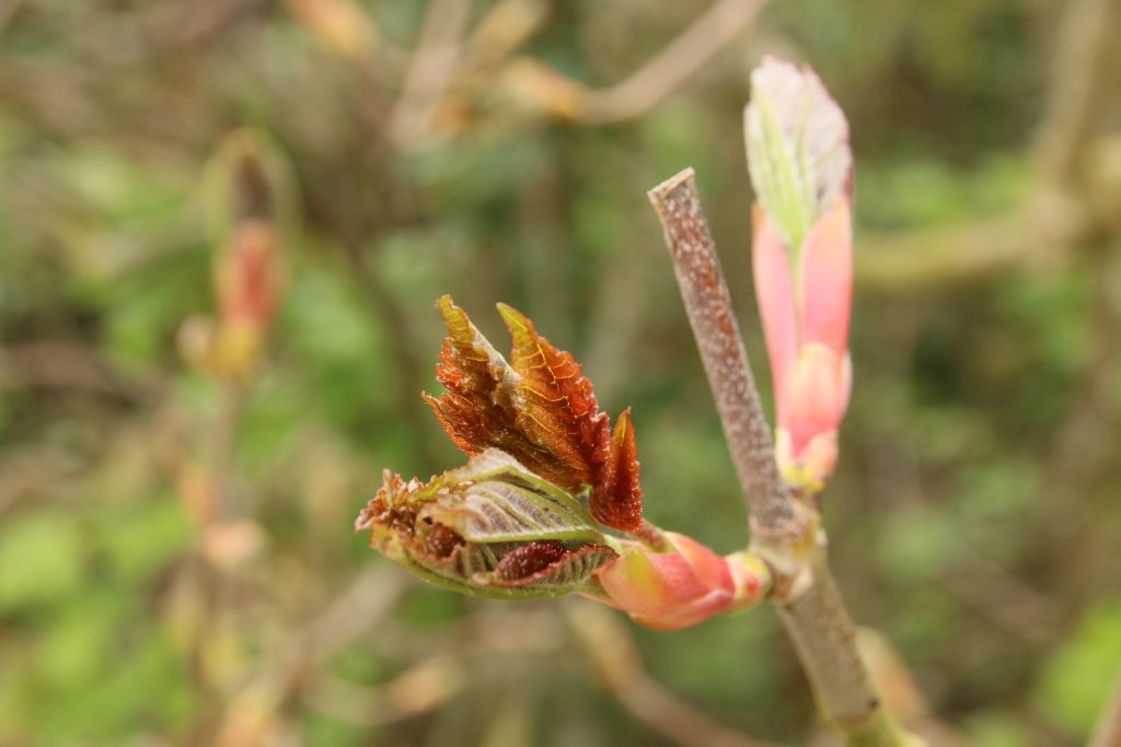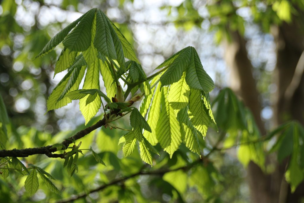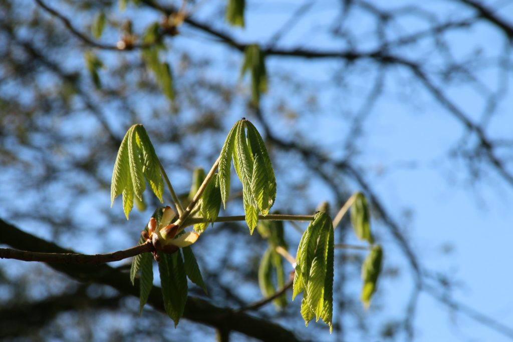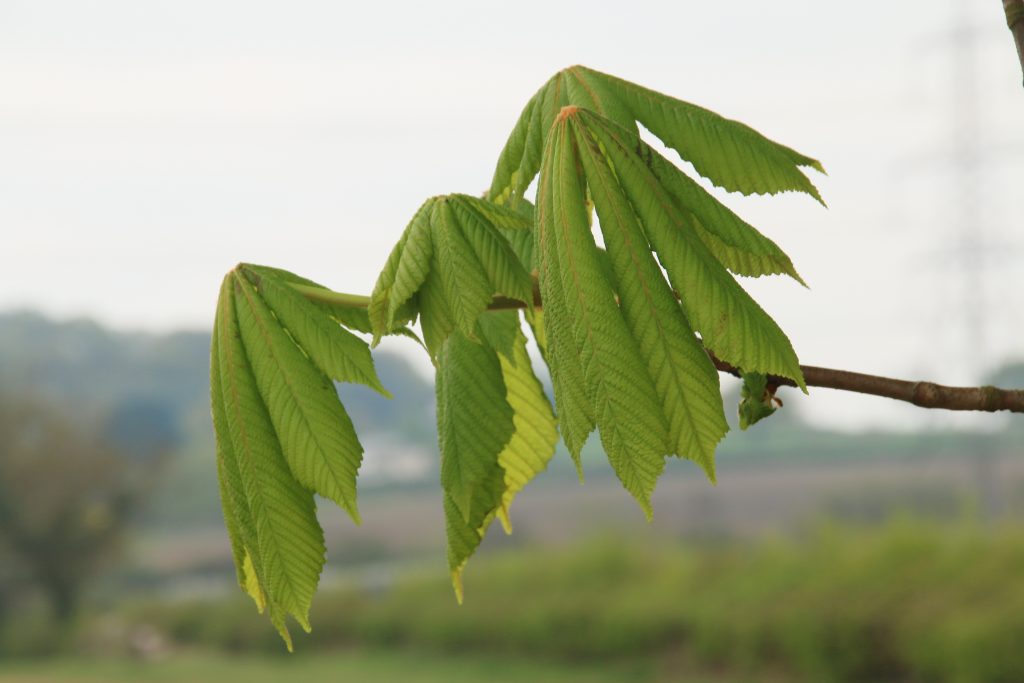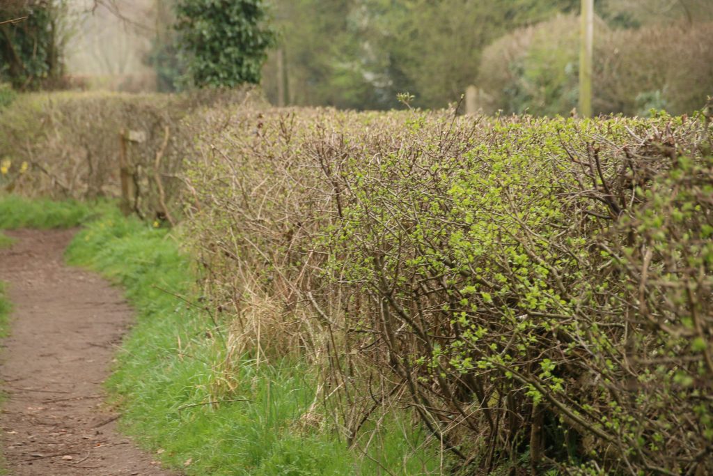 Young leaves are sprouting on hedgerows and trees. Hawthorne hedges display a green sheen as buds burst. Horse Chestnuts leaves have emerged from their Sticky Buds and hang down like small dishcloths left out to dry. Young maple leaves, tinged with pink, glisten in sunshine, pale lime leaves sprout from twig-ends, and delicate hazel leaves line the path beneath the trees that leads into Croft Glebe.