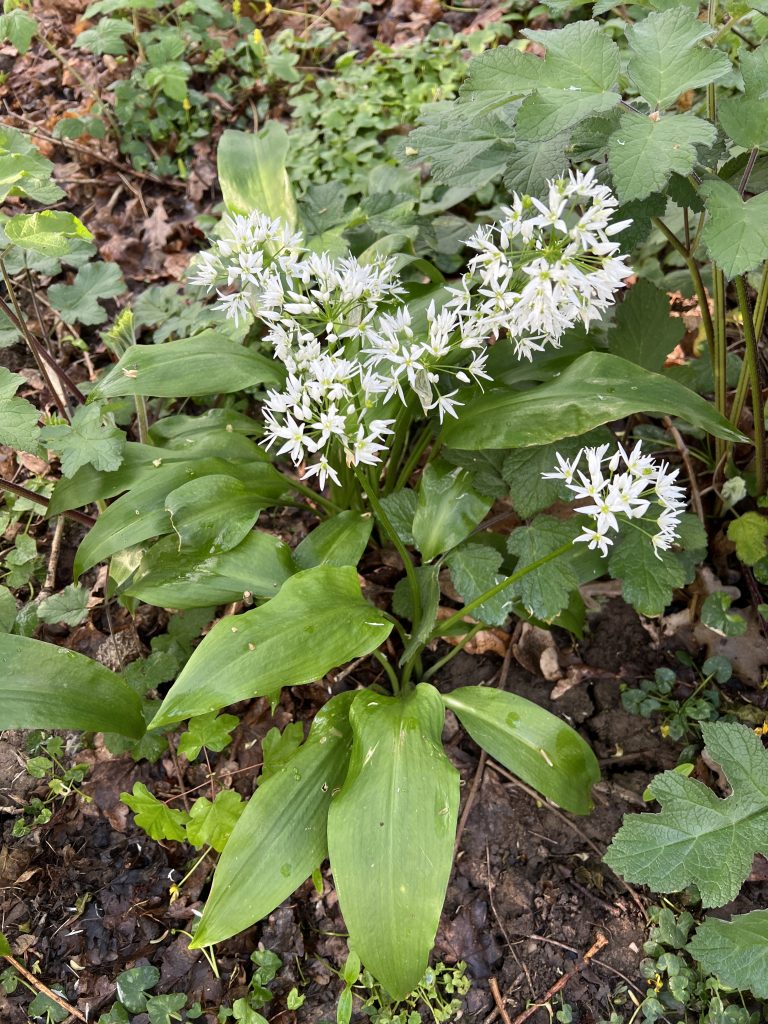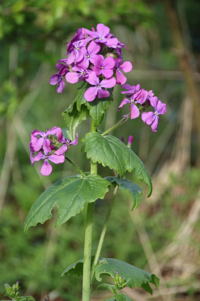 Beside the bridge between the sheep field and the intense yellow flowers of the rape field Hawthorn is still in bud, but not yet blossom, tight green nodules on branches. Away from the arable land, along the path down to the village, hybrid bluebells continue to spread between the trees. Beneath the trees by the Glebe, a shady area that is always one of the last to dry out, individual wild garlic plants are flowering – to be honest a mass of wild garlic plants is really needed for the wonderful garlic smell (if you like the smell!)