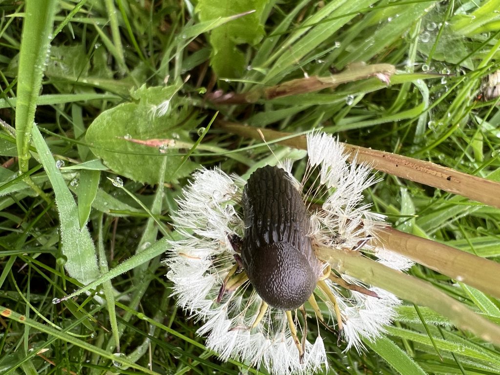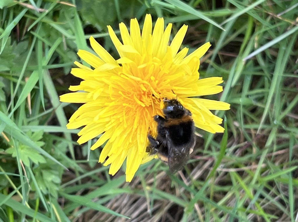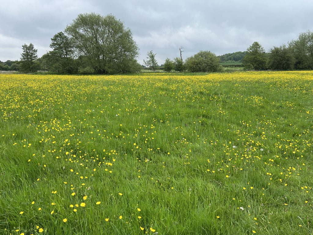 The “sheep field”, a water meadow bordering the river, has been wet for months, soft at the higher end, and squelchy where it dips down to meet the lane that descends from the front of our home before bending around to cross the river before heading into the next village. Now it is firm underfoot, with waist high grass, a sea of yellow meadow buttercups and pockets of cuckoo flowers. During our morning walk the grass is wet with dew, and even with wellies my trousers are soon soaked, as are the dogs as they bound through the grass. The ground is still damp in places, and slugs feed on dandelion seeds in the dips that still remain from the centuries-old ridge and furrow farming system. On the drier ridges it is bumblebees taking advantage of dandelions, in their case collecting pollen from the flowers.