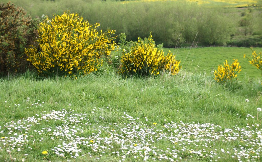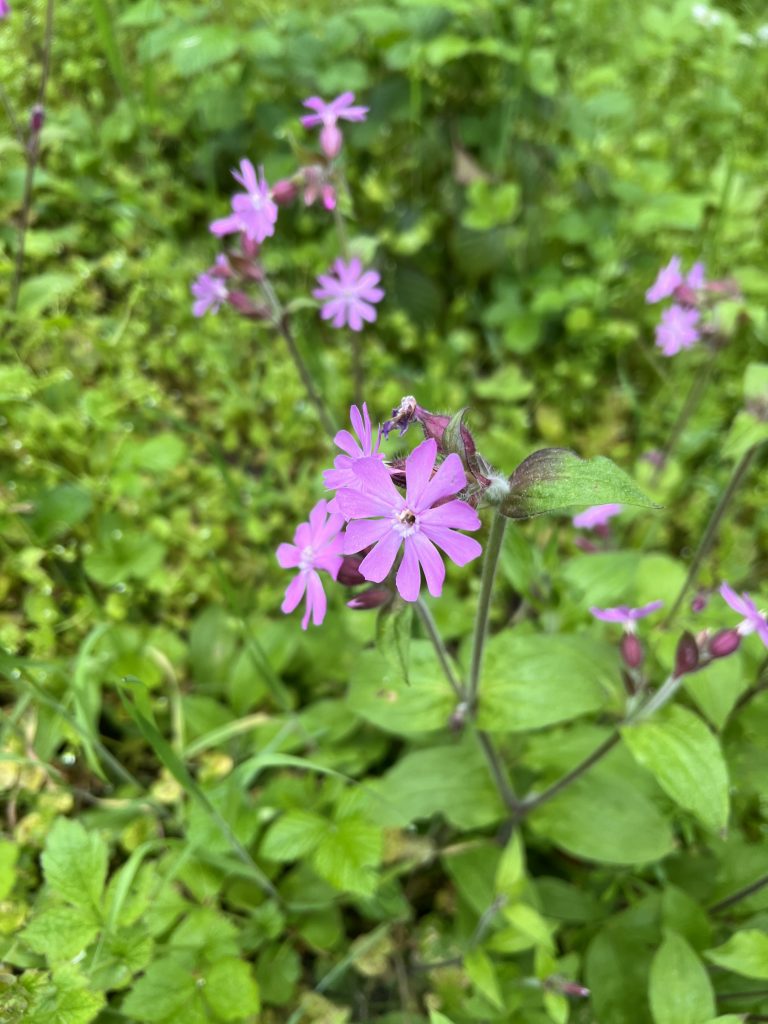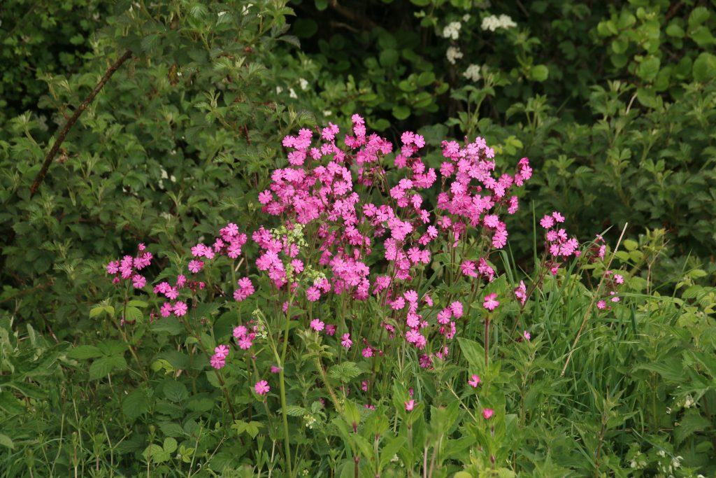 A month ago we set off for a month touring Scotland, travelling from a landscape with hedgerows shimmering, a sheen of new leaf buds, to Western Scotland where hedges and trees were still almost bare. By the time that we left Scottish hedges were coming into leaf, and on our return to the Midlands the countryside was fully clothed in greenery, and meadows a colourful display of wildflowers. Horse chestnuts have blossomed with candle-like flowers, hawthorn blossom is almost over but still provides a display, and pink dog roses on thorny branches contrast with the yellow gorse blossom on the daisy-strewn path around the quarry edge. Red Campion borders the path that leads down to the village.