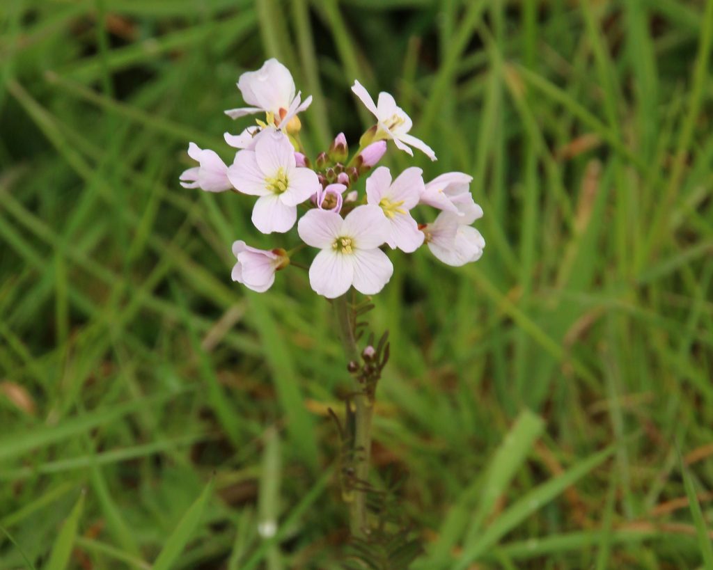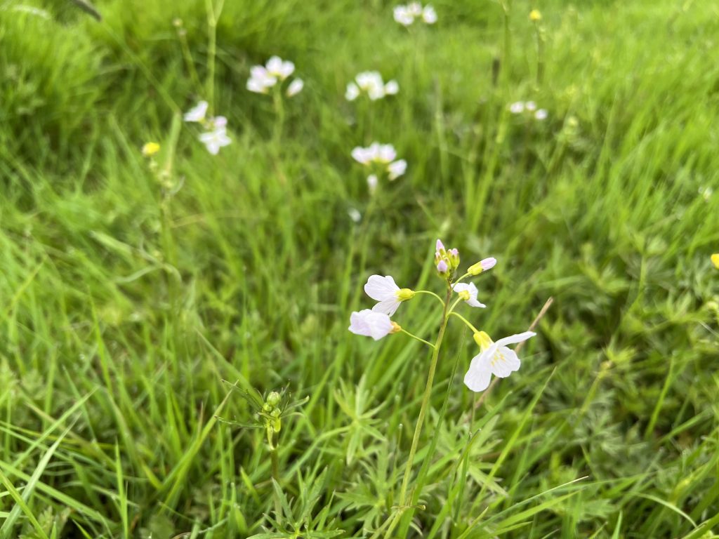Young plants are growing in neat straight drills in the field behind the old barn. I think that these are young bean plants, cattle beans for feed rather than the culinary varieties grown in gardens. We shall see in due course. Pale pink Cuckoo Flowers, or Ladies Smock, have appeared in the sheep field. This damp meadow side pasture is the perfect environment for them, and over the next couple of months they will multiply as seeds propagate and each plants spreads, as primroses do. They may be cut down in their prime if sheep are introduced into the field.