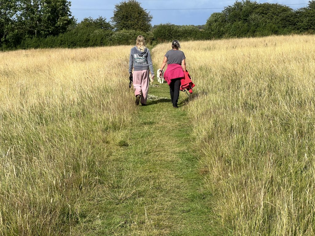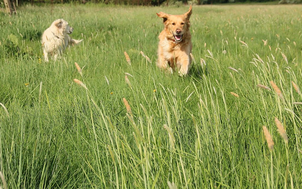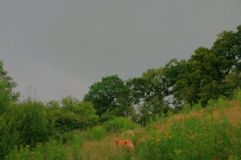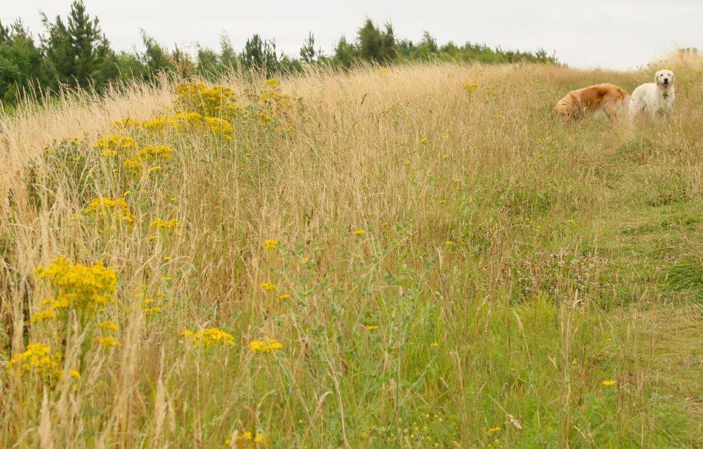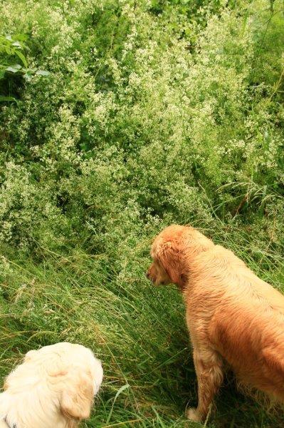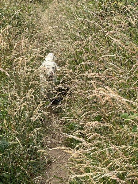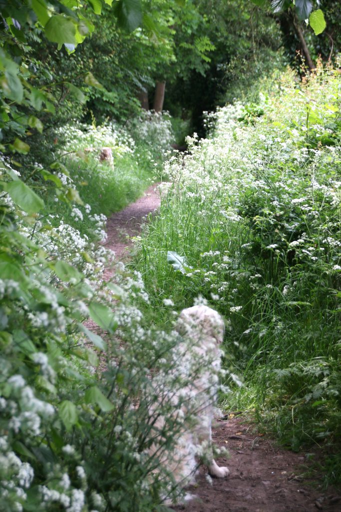 Many of our walking routes are almost overgrown with high grass and occasional nettles. The dogs have tunnel vision, the grasses above their heads, but it doesn’t bother them. Dogs “see” with their nose. The view each day may seem the same to me, but to the dogs the smells of wildlife and other dogs that have passed that way since they last pushed their way along a grassy track means that the “view” is different on each occasion, with scents sometimes leading them into the surrounding grass. Frustratingly the “Sheep Field” has yet to be mown, either for sileage or hay, and it is hard work walking through the tangled long grasses.