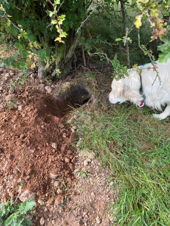 Most walking routes pass the bottom of Croft Hill, and I climb the Hill on most days to get my heart pumping – the Hill is not particularly high, but above the surrounding countryside, with views for miles. The dogs wonder off the tracks following scents, and sometimes I have to follow to “clean up” after them, and it was while undertaking the dog-owners-duty that I discovered a freshly dug burrow, too big for a rabbit, likely to be a badger sett. From www.badgertrust.org.uk “Badger setts vary from occasionally used “outliers”, which often have single entranced tunnels, to vast, ancient underground complexes with multiple entrances”. This one is clearly a newly dug outlier. There is a large sett on the north side of the Hill, but this has been abandoned for many years, the holes remaining as a trip hazard to those straying far from the path.