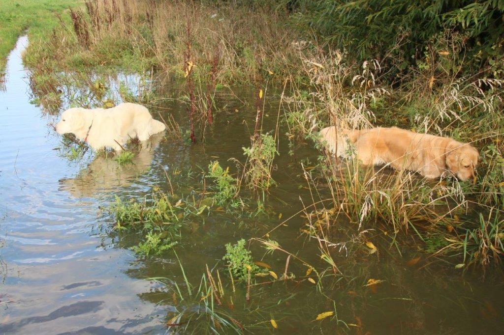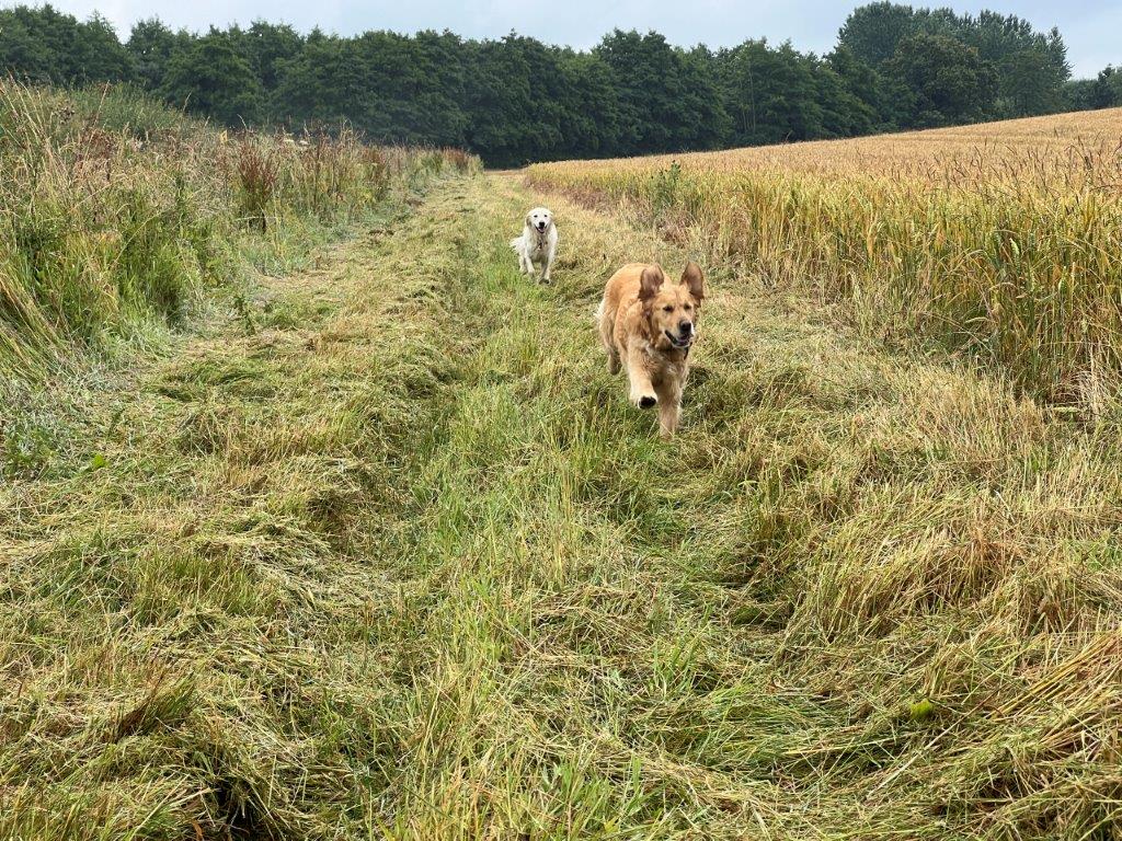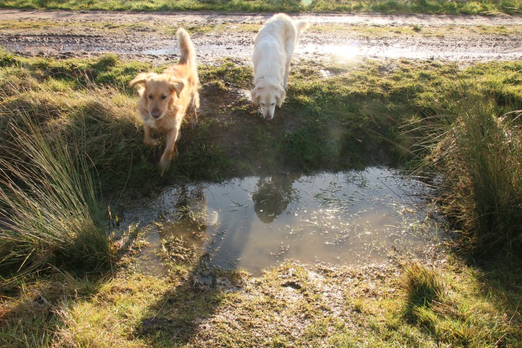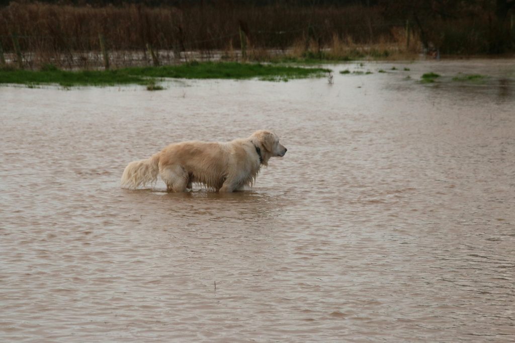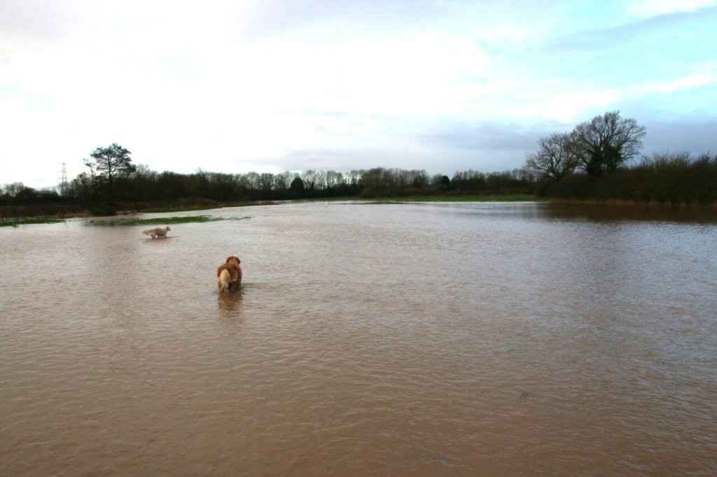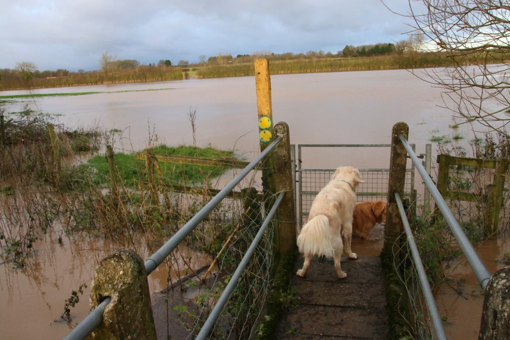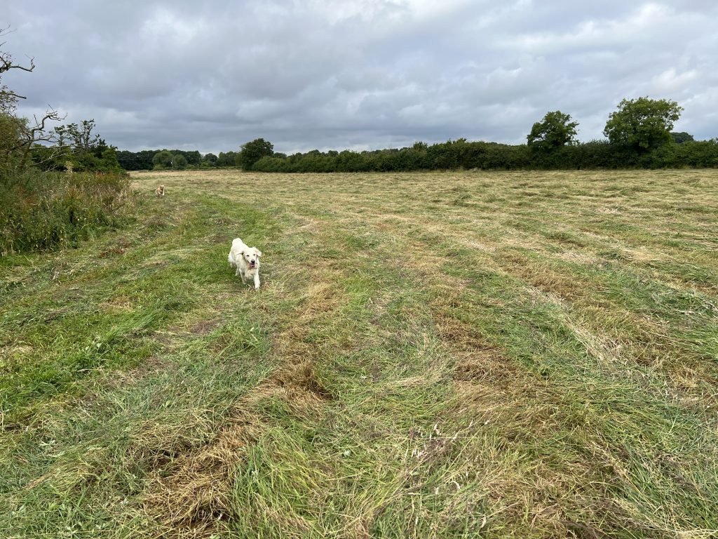 We had rain last week, heavy and thundery, lasting for hours, falling onto parched earth. Flash flooding of roads was inevitable, but fields, although soggy and with standing water, were nowhere near as flooded as would be expected after prolonged rain over winter. The dogs enjoyed splashing through the water in the “sheep field”. The sheep have been evacuated in the last day or so, maybe as already planned, or maybe because of the potential for worse flooding in the riverside meadow. Markers have appeared for as local running race, the route including this field and surrounding footpaths, which may become churned up with mud. We may have some muddy dog walking routes over the next few days