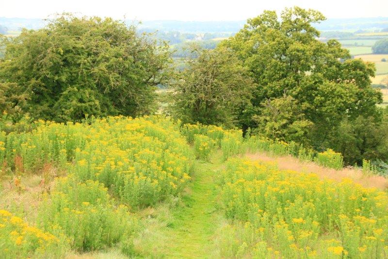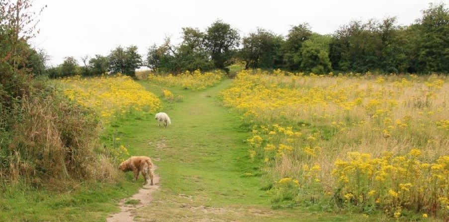 It rained heavily last night, and we avoided the grassy paths. I would need to wear wellies and waterproof trousers to avoid a soaking from water-laden grasses, although the dogs would have no objection to returning home wet. We met someone who had walked along a path bordered with high grass, and he was soaked to the waist. Instead, I donned my walking boots and walked up Croft Hill, where rabbit-grazed turf is short, but even on the Hill the path is bordered by knee-high plants, in this case yellow Ragwort, which at least keeps to the edge of the path. Ragwort is poisonous to livestock, although large quantities would need to be eaten. Until a few years ago the quarry owners, who own Croft Hill cleared the weed annually before a few cattle were grazed over the Summer and Autumn to encourage wildflowers. Sadly during the Covid epidemic large groups of young people gathered on the Hill, fences were broken, and no cattle have been grazed since. Ragwort has been allowed to flourish, which is at least is appreciated by the many insects that feed on it.