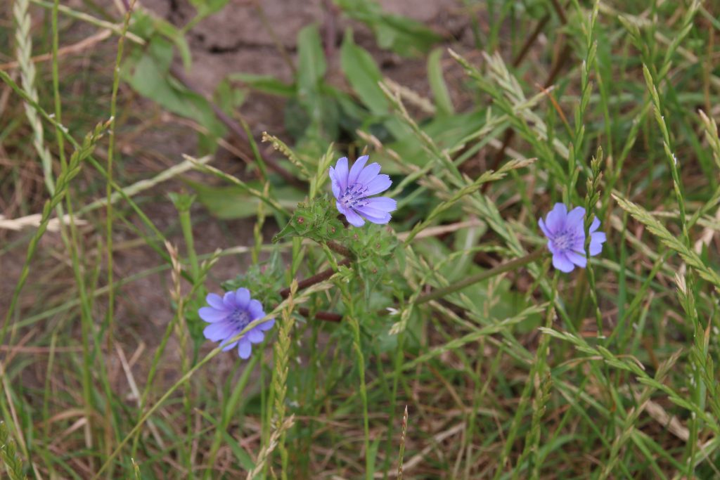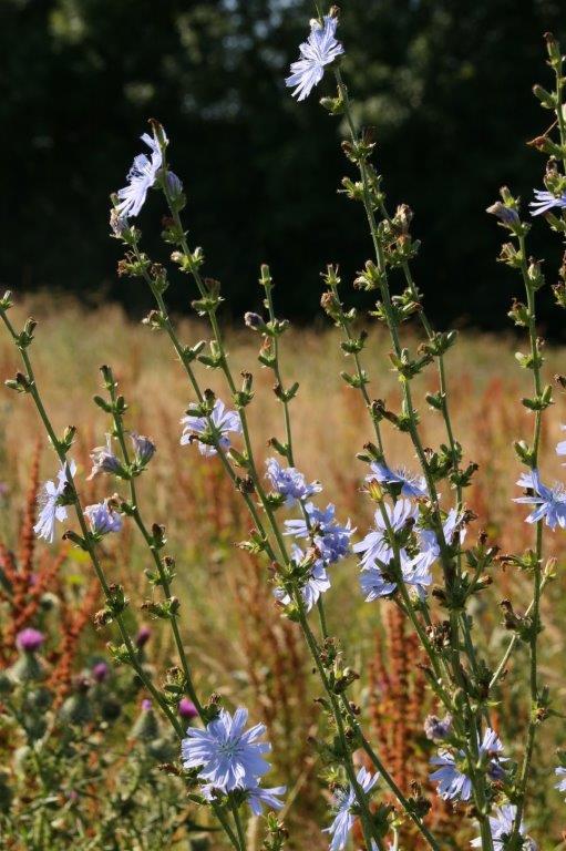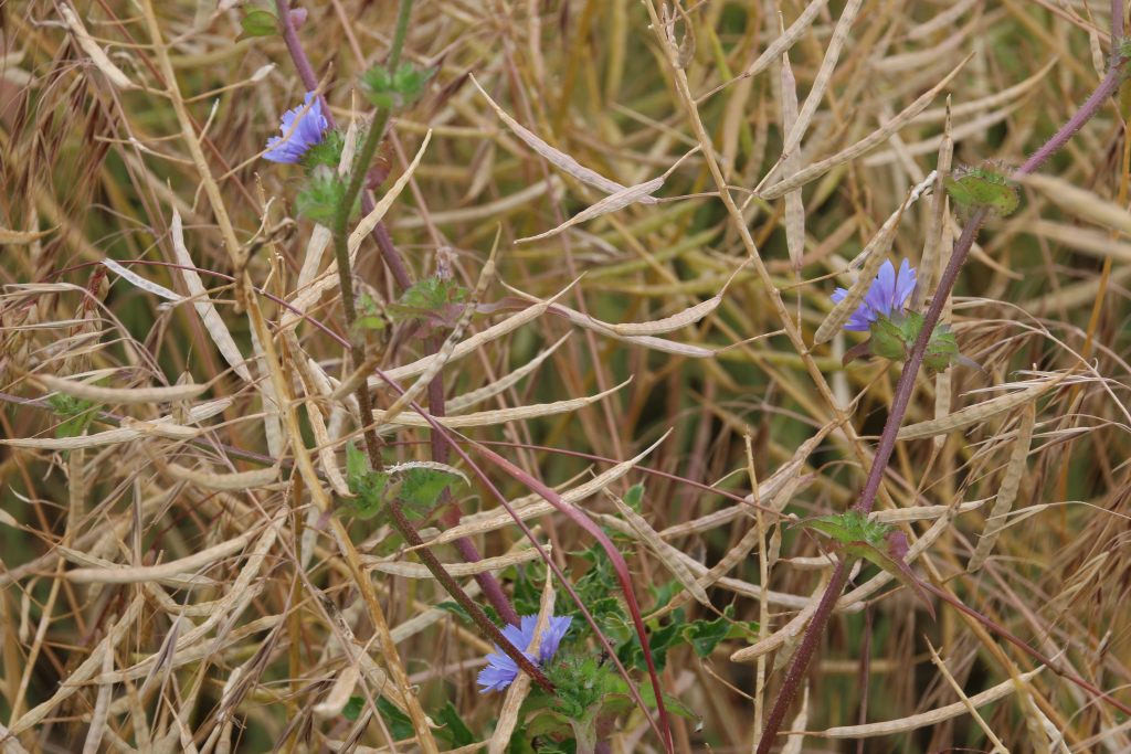 The farmer does not mow to the field edges, leaving large areas of wild grasses, with a few wildflowers. Tall Meadowsweet huddles at the very edges of the field, preferring the less dry conditions at the bottom of the hedge at the side of the field that borders the river. In contrast Common Chicory prefers the open grassland. Some will have been mown and baled with the hay, but blue Chicory flowers have been left among the unmown areas. Walking back up the field track to our Lane I notice that Chicory is also growing at the edge of the brown rape crop, taller specimens than in the sheep field.