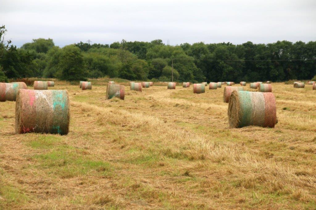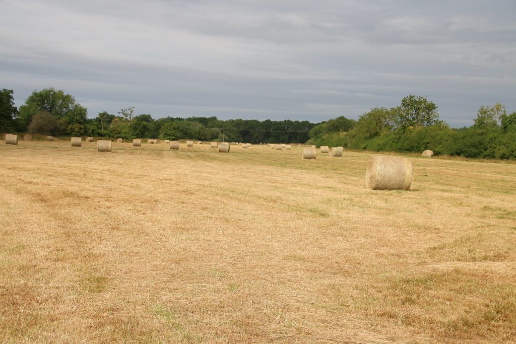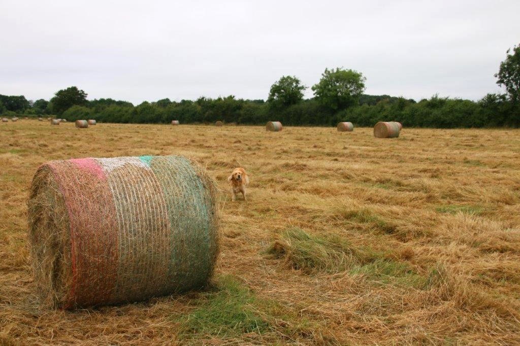 A fresh morning with a cool breeze after a short-lived heatwave – more hot weather forecast over the next few days. Last night a friend joined us for a walk with her spaniels, and we decided to walk around the recently mown sheep field. The strong breeze had blown the neat lines of hay into each other, and we were forced to wade through ankle deep drying grass. This didn’t bother the dogs, who leapt and ran through the hay. As we left the field a tractor and baler appeared, and this morning the hay had been gathered into large round bales, with acres of short mown grass in between. I decided to walk around the field again, to the delight of the dogs, who ran in circles chasing each other before following the scents of wildlife that had been in the field last night.