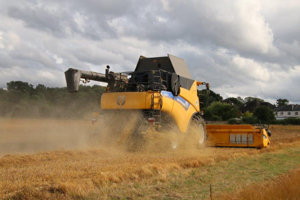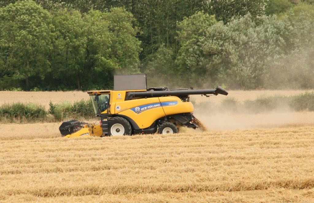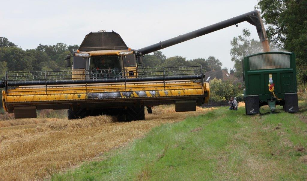 The vast combine harvester, noisy from numerous fans and belts, cuts the wheat, separates and stores the grain, and spews the straw, wheat stalks, in a line out of the back, together with a lot of dust into the air. When the tank is full of grain it is ejected to a trailer, drawn alongside by a tractor and taken to the farm for storage and possible drying. To keep the combine working there is a steady stream of tractors and trailers arriving empty, drawing alongside the combine, and leaving full, in practice two or three trailers depending on the distance to the farm.
