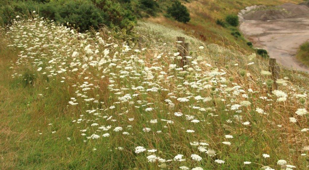The grassy slope down to the quarry is a sea of white wild carrot flower, which also line the path above. Maybe of more concern is the ragwort also growing along the path. The Hill on the far side of the quarry is yellow with this invasive plant, and if uncontrolled it will spread around the quarry. Below me looking away from the quarry I look over Huncote. Between me and the village is a cultivated field with a group of men in Hi-Viz jackets. There is a Planning application to build houses on this field, and ground investigations have already begun. Notwithstanding recent political changes, this field was always intended for housing – the smaller housing estate beyond has cul-de-sacs that end in farm gates, a sure sign of a long term intention to extend the roads into another development.