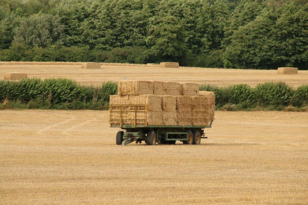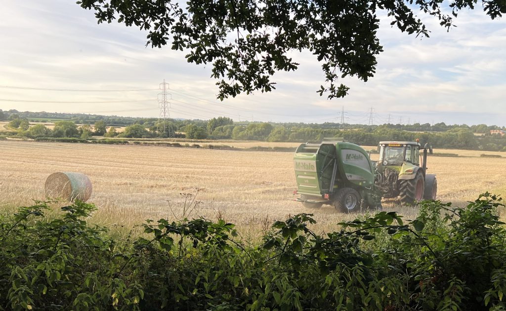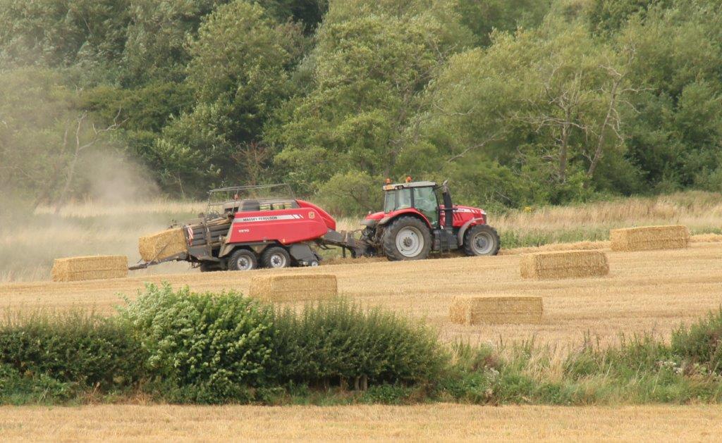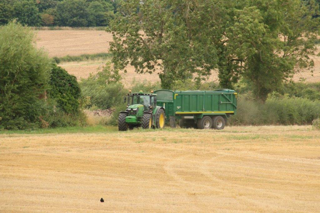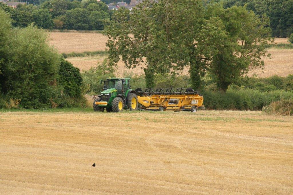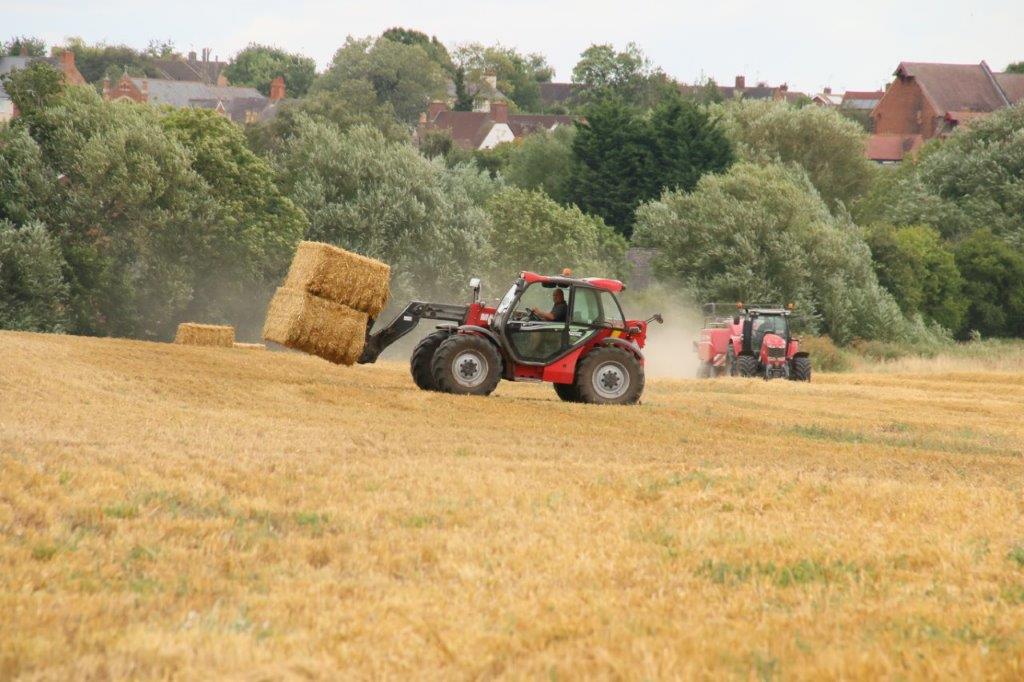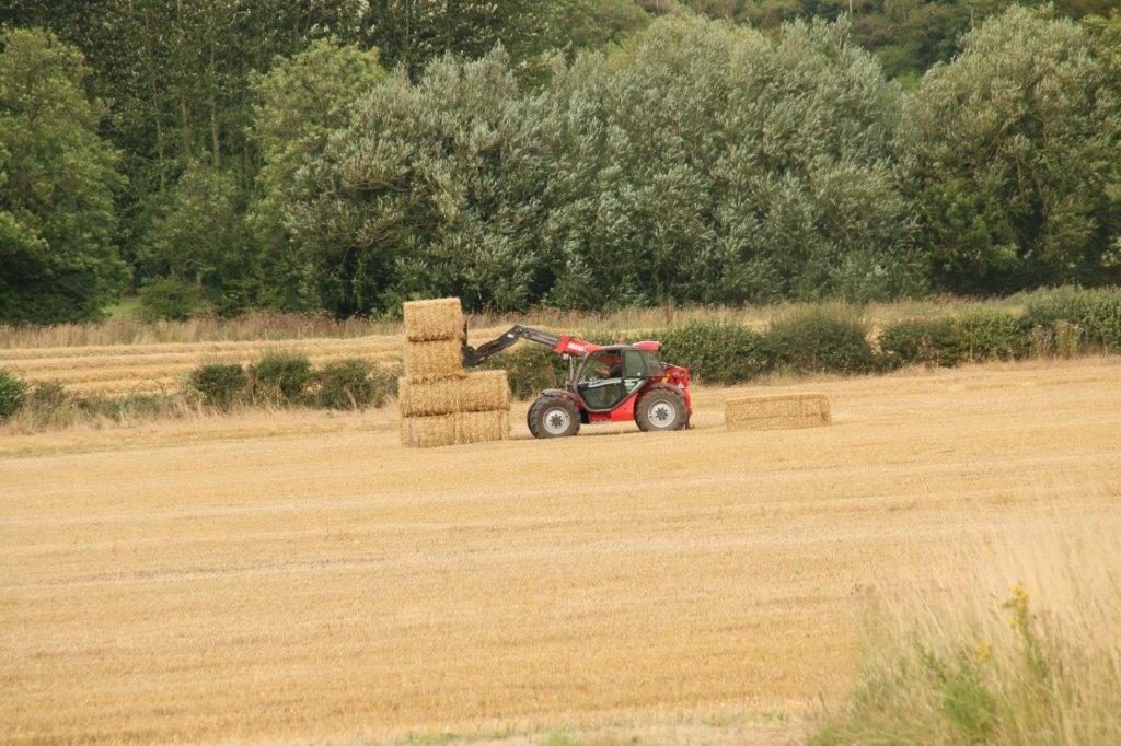 Meanwhile a tractor pulls a baler along the lines of straw, collecting the straw, compacting and tying the straw into bales, round, or in our case this year, cubes, which are ejected at the back. The bales are collected and stacked by a lift truck, that also lifts the stacks onto a trailer to be removed for sale or storage. Bales are sometimes left on the field to be collected by a purchaser, perhaps for livestock bedding, but until they have gone, the field cannot be cultivated. This year the bales behind us were removed on the same day.
