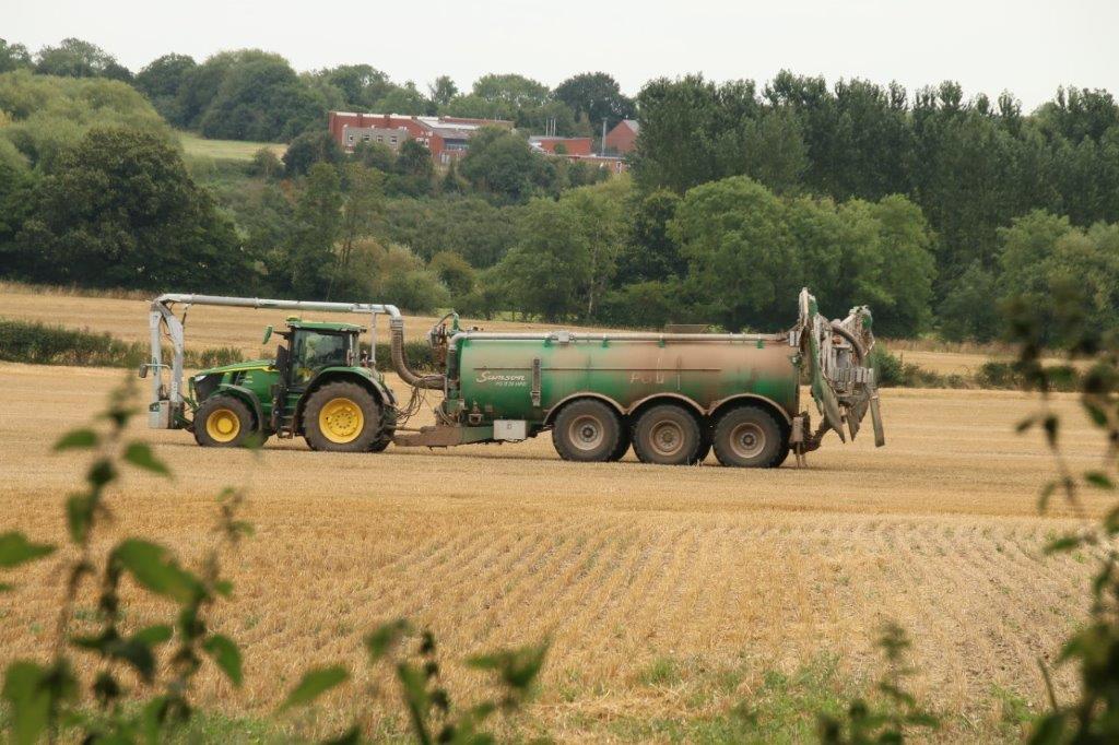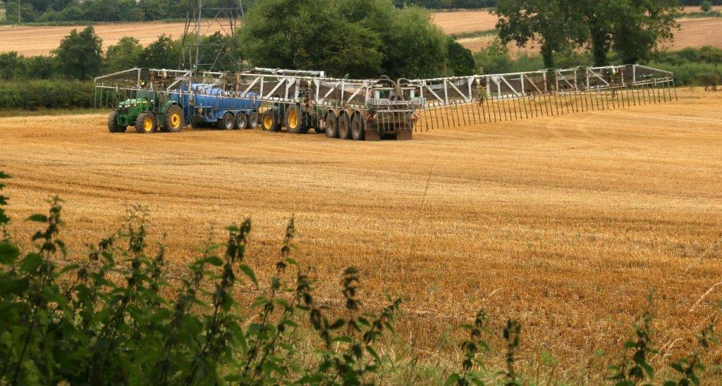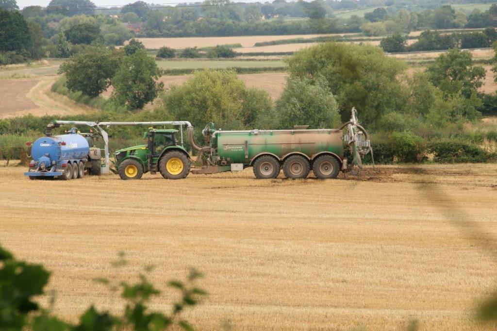 After the harvest the ground is prepared for drilling (sewing) the seeds of next years crop, either sown in Autumn (“Winter” cereal) or in Spring (the more logically named “Spring” cereal). This year, for the first time in a few years, the ground was sprayed with slurry, waste from indoor intensively reared livestock, the slurry sprayed from a tractor-towed tank, refilled from smaller tanks constantly arriving at the field to top up the larger tank. Transferring the slurry seemed to take longer than the actual spraying. In the past the slurry has been injected just under the soil, but this year it was sprayed onto the soil surface, puddling around the hard ground at the field edges.