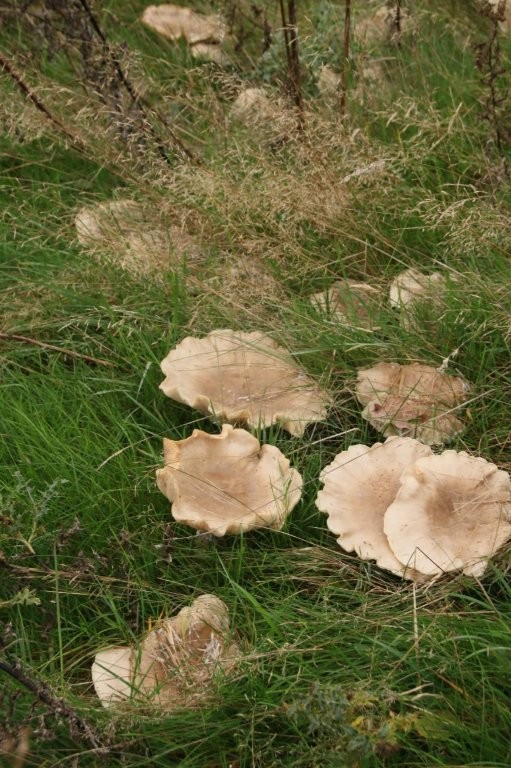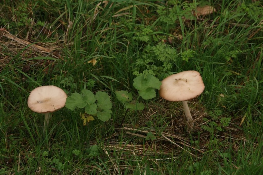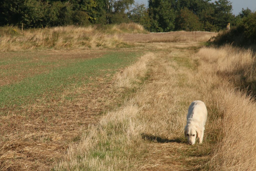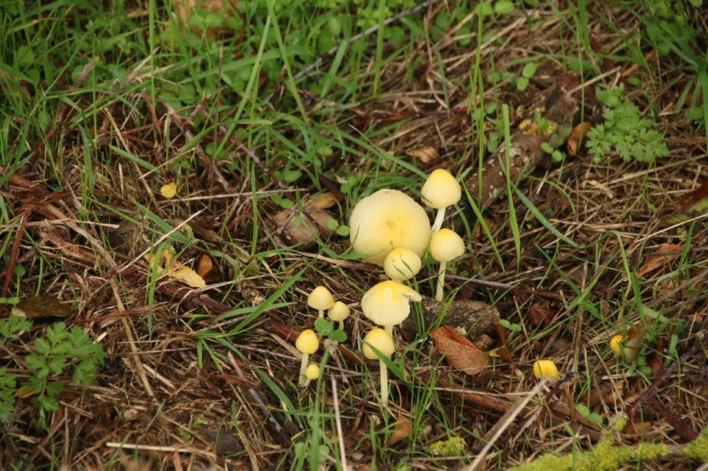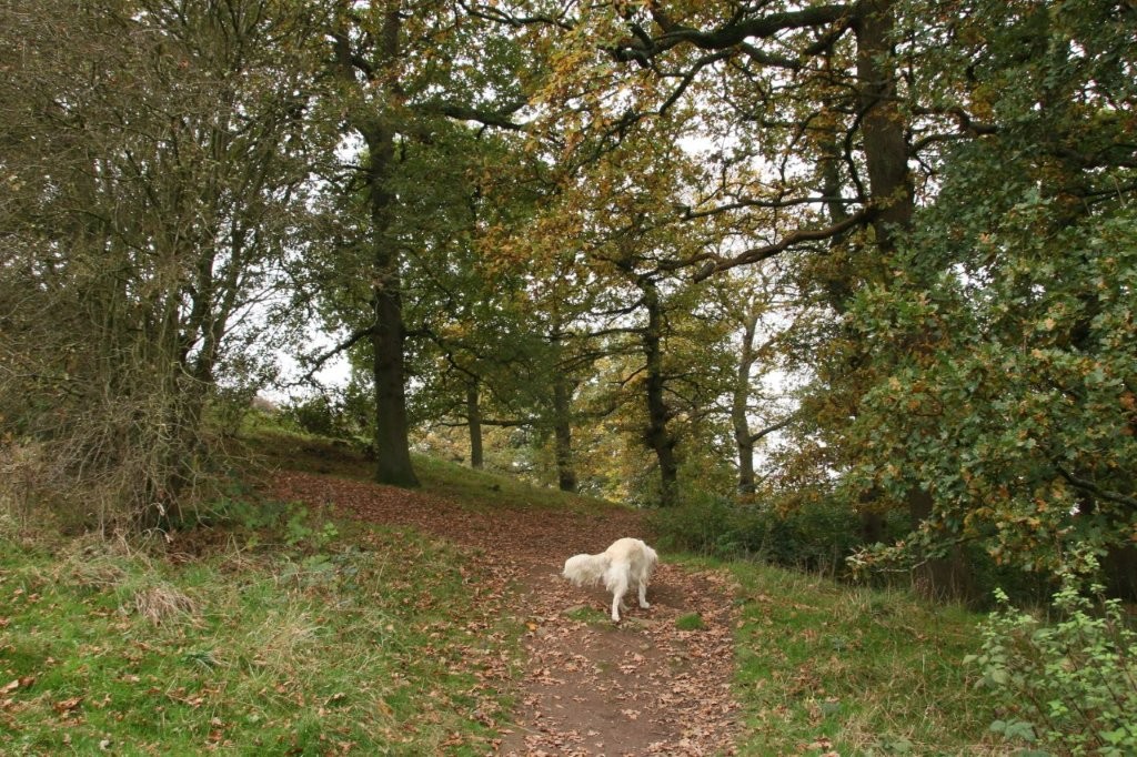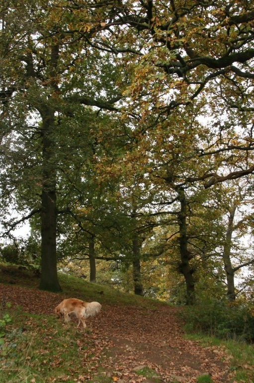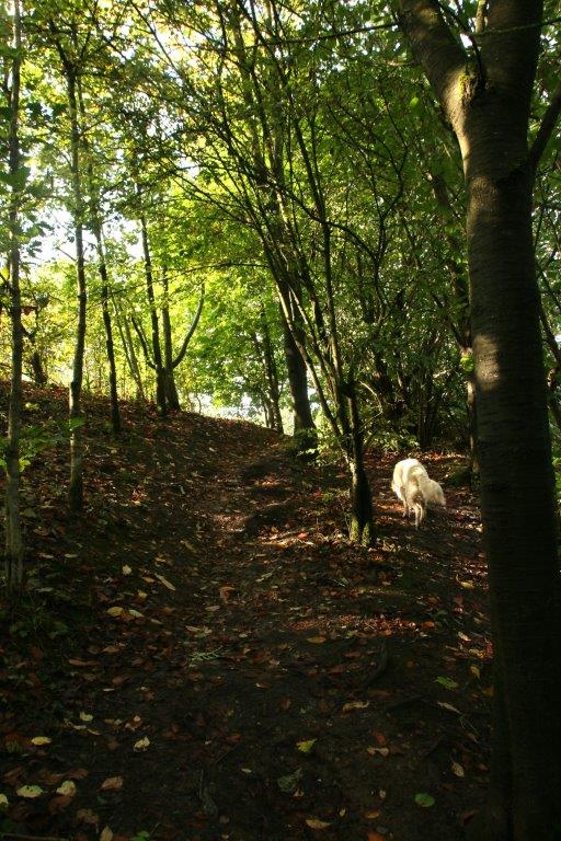 A few mushrooms are growing on the slopes of The Hill, although not as many as on previous years. Sam showed an interest in a line of fungi ascending the hillside, no doubt part of a large ring of mycelium, with this area being the only fruiting bodies that have emerged above ground. Usually at this time of the year there are several varieties of mushrooms and toadstools visible on the hillside – recent warm wet weather may have delayed the season this year. There is no sign of Autumn colours in the trees or hedgerows, with morning sunshine dappling the ground through a green canopy that has changed little since summer