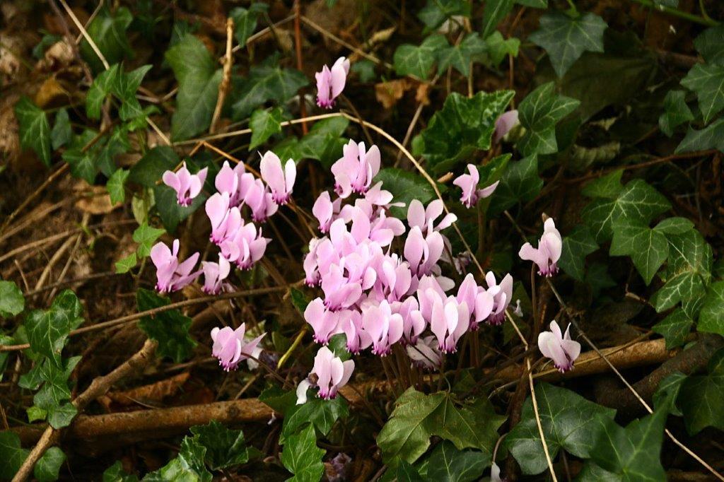 Despite these signs of a season ending, there is cheerful colour alongside the tree-lined path down to the village, where Autumn Cyclamen, a garden plant that has successfully established along this path, possibly planted by hand some years ago. It has now spread into the adjacent woodland.