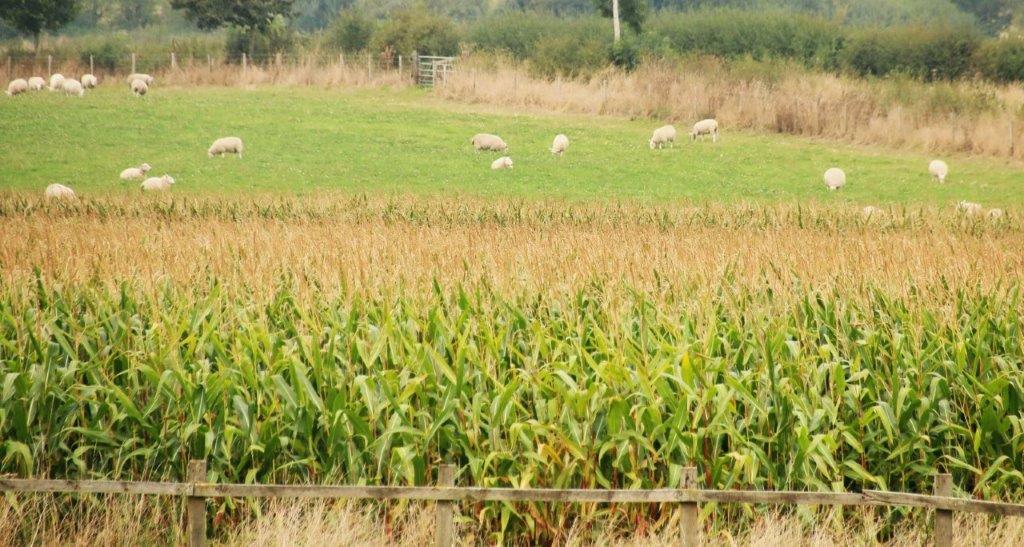 In contrast to these young plants drilled, or sown, after the traditional harvest, we have maize, sweetcorn, in the field on the other side of our lane, which will be harvested in October. The cobs will be used for animal feed.