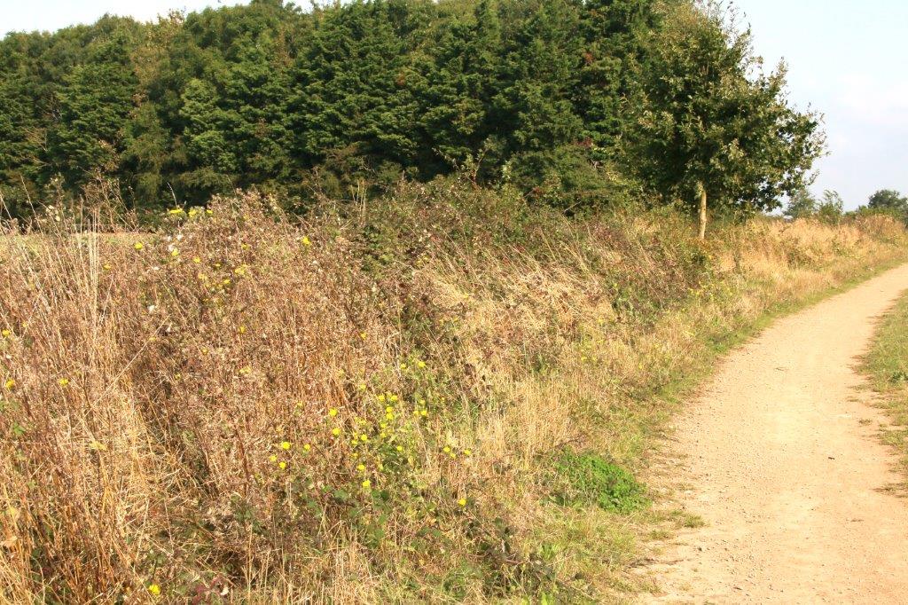 We turned away from the field along a grassy path leading to a farm track, bordered by daisies and yellow Bristly Oxtongue, the flowers resembling tall dandelions, the track leading to the footpath back to our Lane.