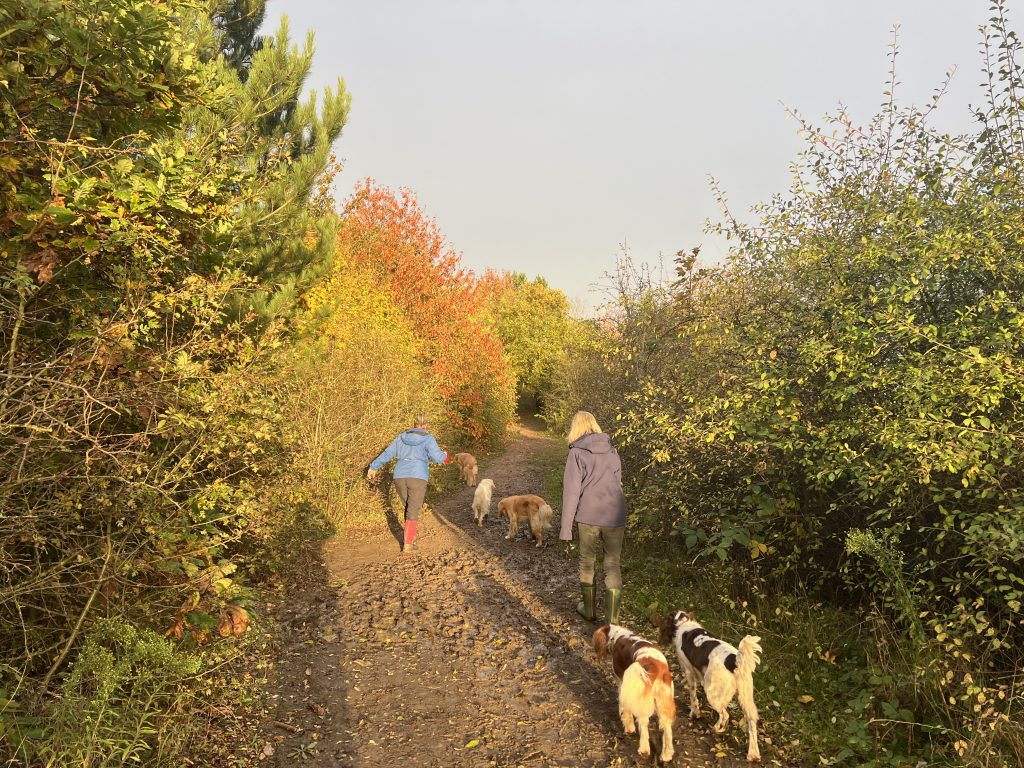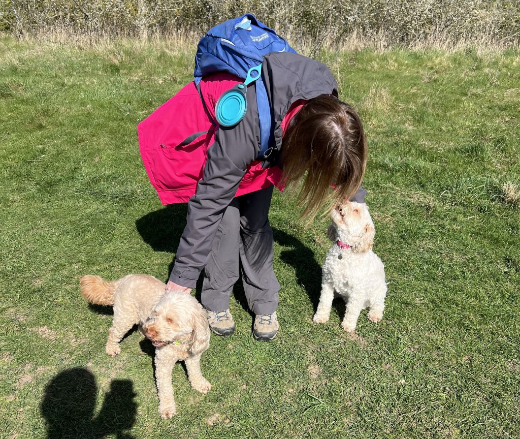 At the end of the track back onto the Lane we meet a couple carrying a drone – the quarry and Croft Hill is quite popular with those who like to fly drones. Again, I make the dogs sit and wait, but they stop to rummage in their rucksack. Both dogs decide that there just might be treats in the bag, and bound over – luckily both drone-fliers are quite happy to make a fuss of Sam and Ellie.