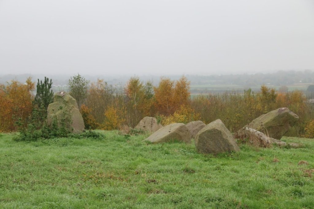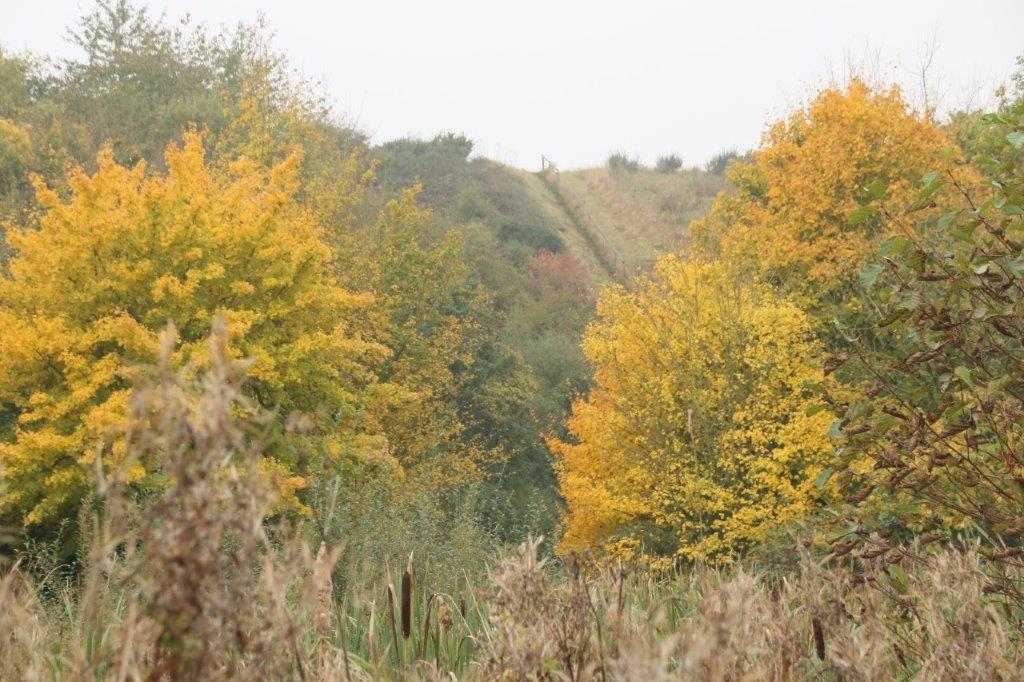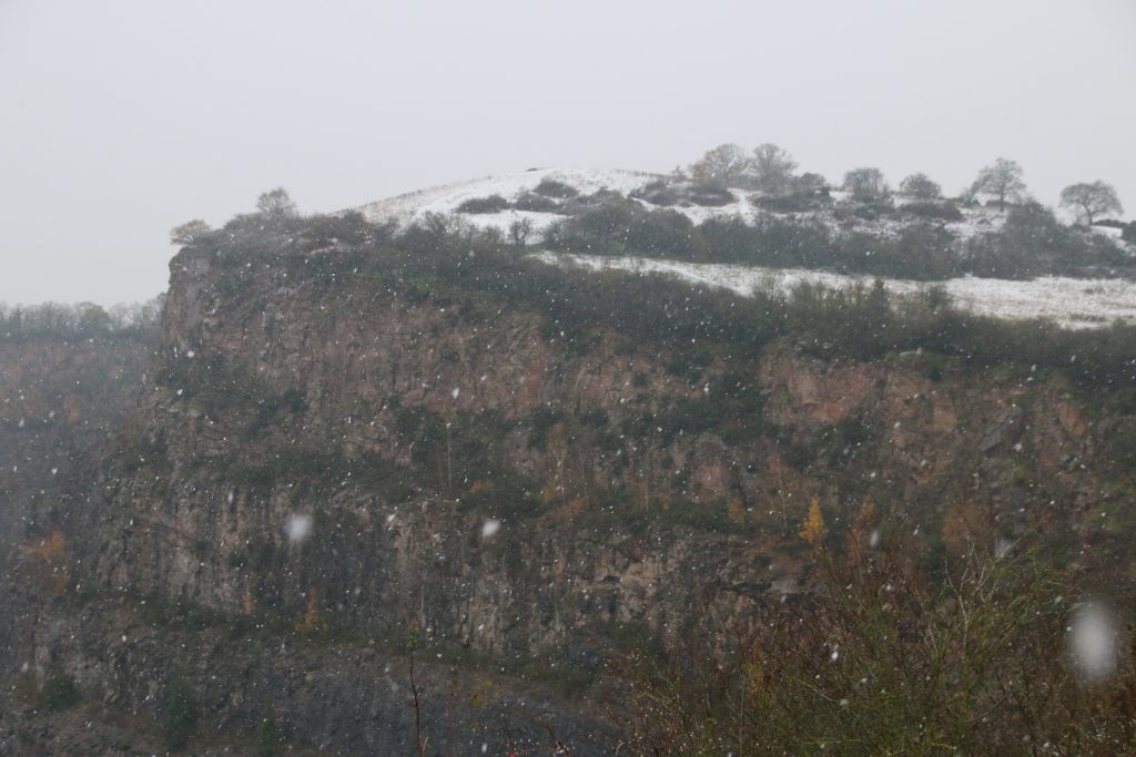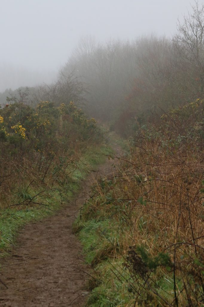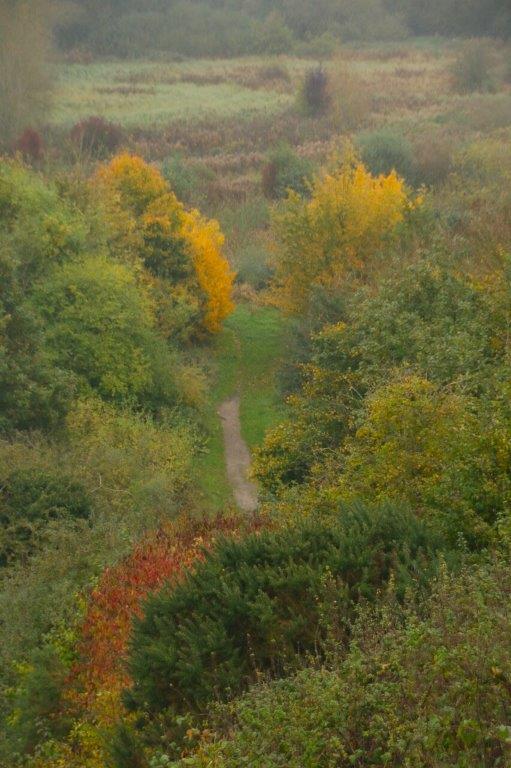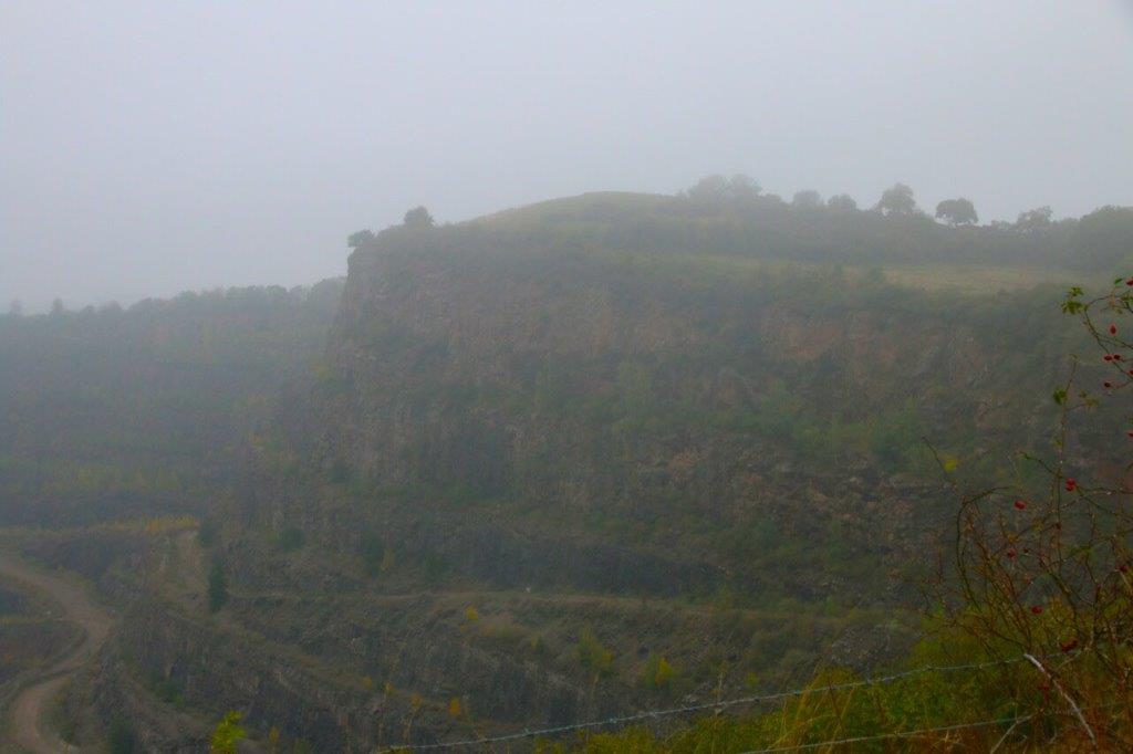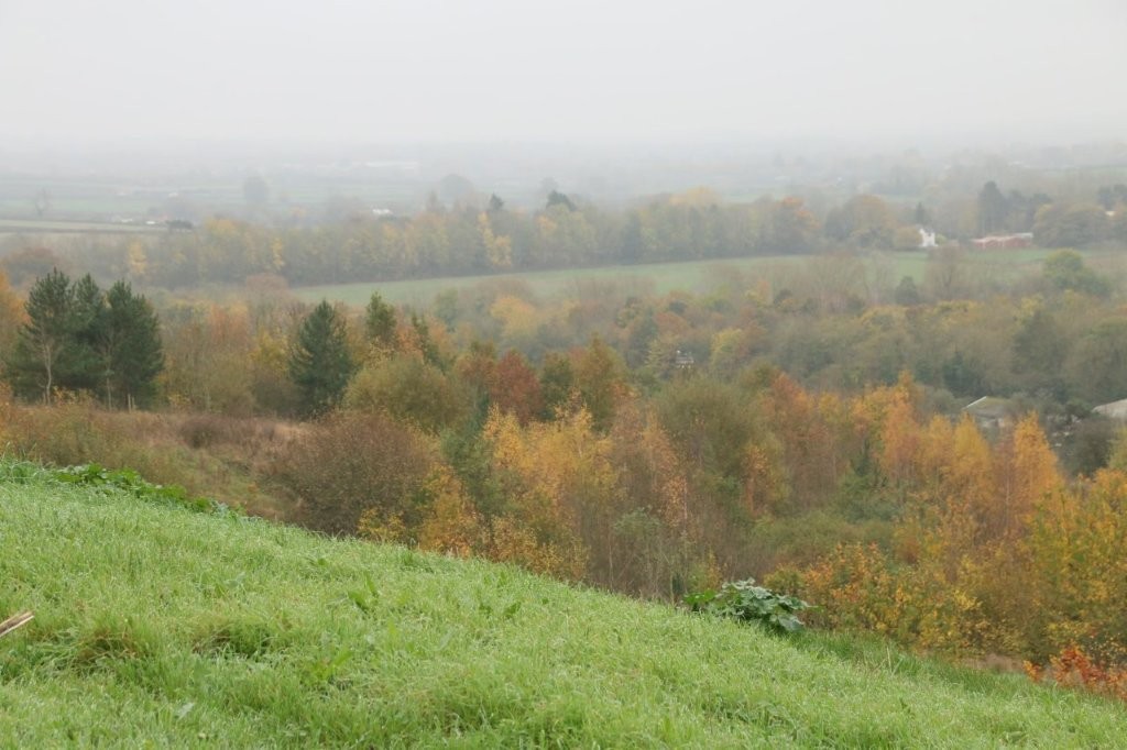 A truly Autumnal morning, misty and damp, but unseasonably warm, one of those days when outdoors seemed to be warmer than indoors. From the quarry edge the outline of Croft Hill was softened by mist, and on the other side of the path the fields below gradually merged with the sky as they stretched into the distance. Within the last couple of days trees have started to change from green to red, yellow and gold, although still with a backdrop of greenery from trees yet to change.