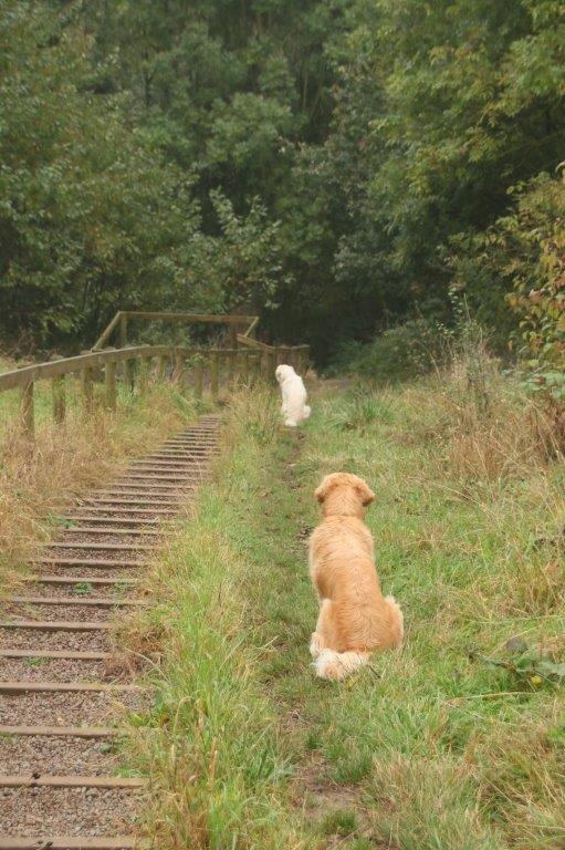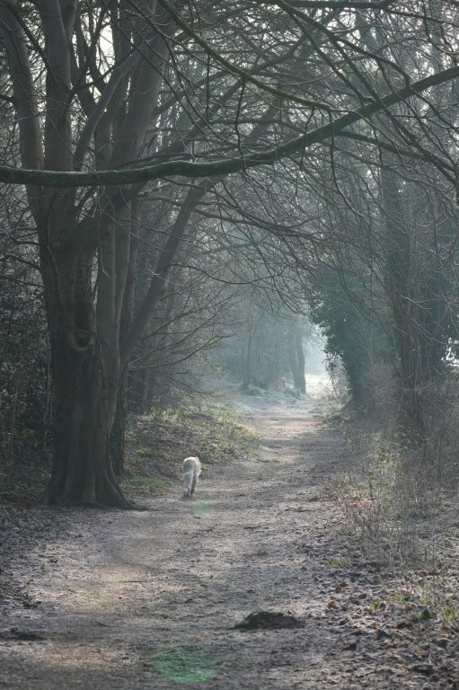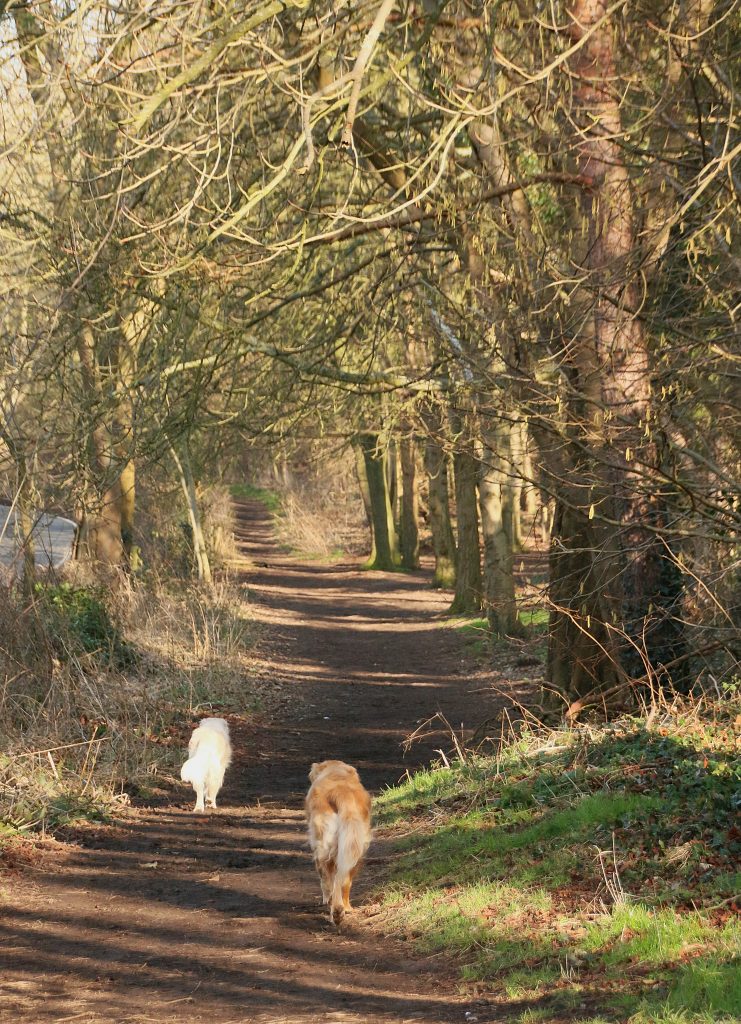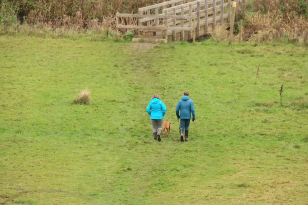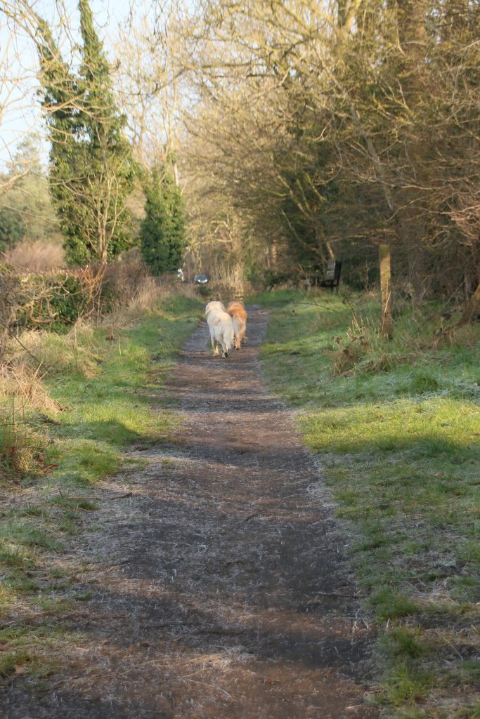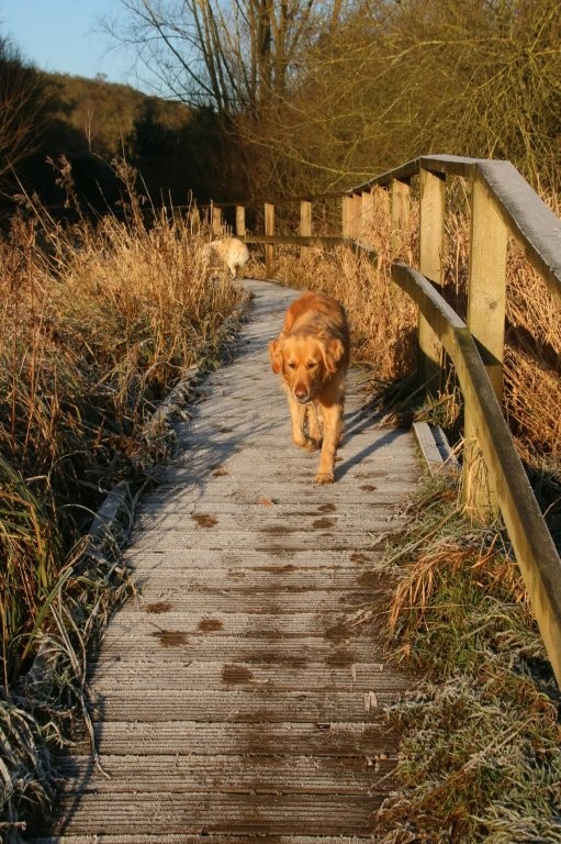 The top of the hill is exposed to the northerly wind, and I decide that wearing an extra layer was a good plan after all! We turn around and descend the steps to the wildlife ponds. I do not like these steps, and most regular walkers agree – they are deep, with one-and-a-half paces between steps, all very awkward, and I take my time as Sam trots ahead to the bottom, where I command him to wait. From his stance I realise that he has spotted someone, and I command him to sit. Just out of sight at the bottom a couple are waiting with an obviously nervous spaniel on a lead. I put leads on both Sam and Ellie as we pass – I am impressed that Sam waited obediently just a few feet away.