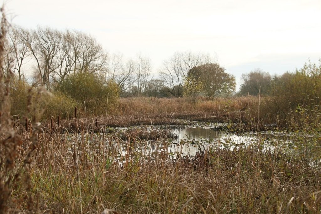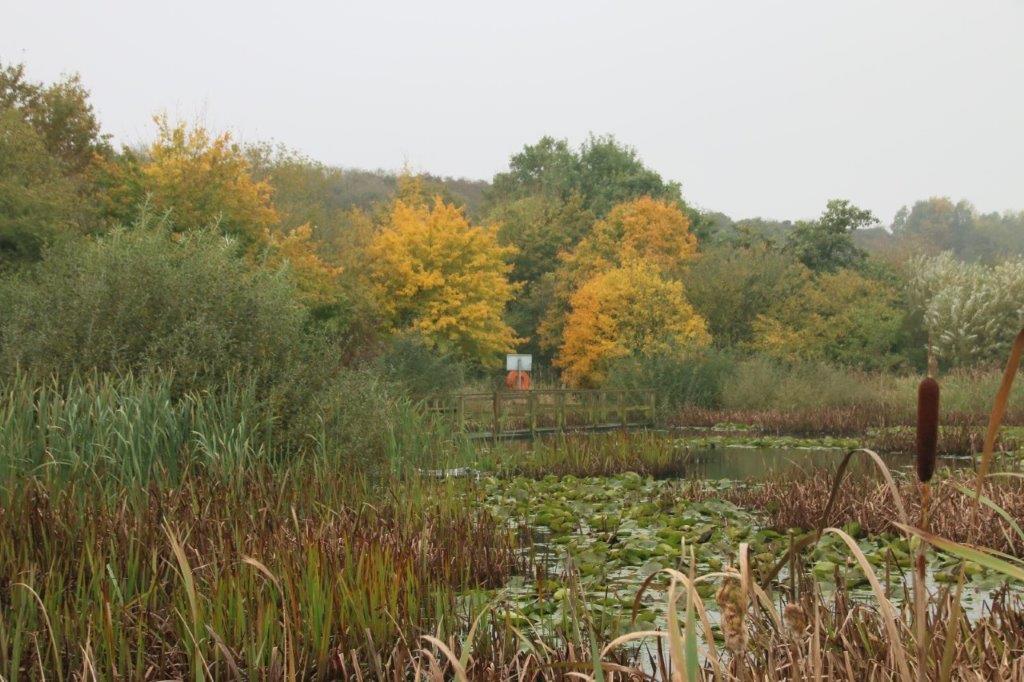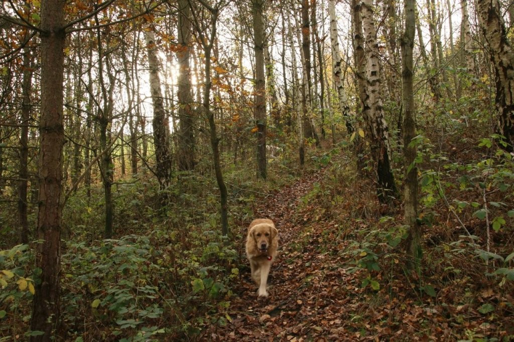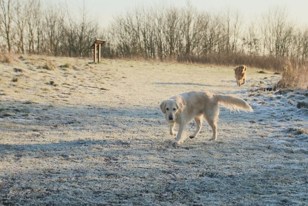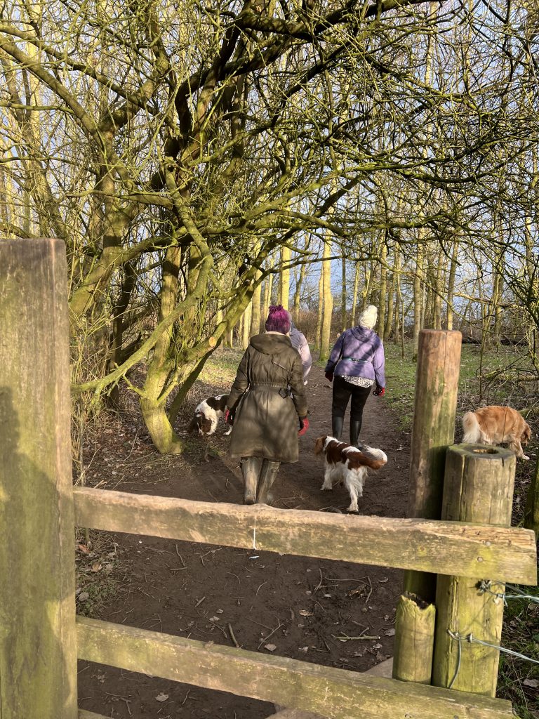 The top of the hill is exposed to the northerly wind, and I decide that wearing an extra layer was a good plan after all! We turn around and descend the steps to the wildlife ponds. I do not like these steps, and most regular walkers agree – they are deep, with one-and-a-half paces between steps, all very awkward, and I take my time as Sam trots ahead to the bottom, where I command him to wait. From his stance I realise that he has spotted someone, and I command him to sit. Just out of sight at the bottom a couple are waiting with an obviously nervous spaniel on a lead. I put leads on both Sam and Ellie as we pass – I am impressed that Sam waited obediently just a few feet away.