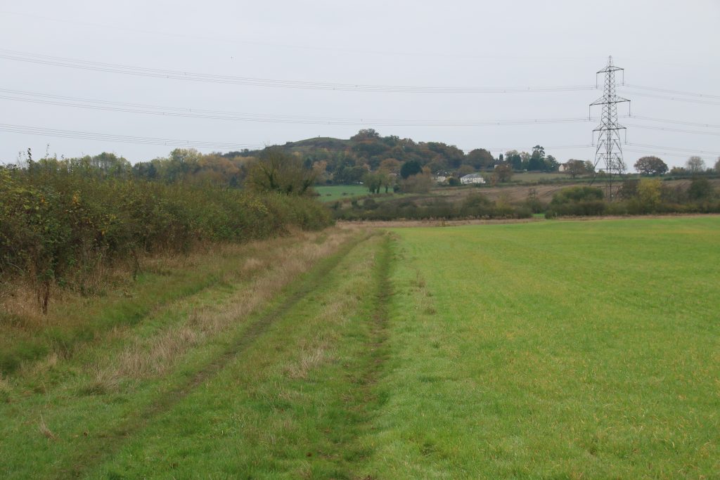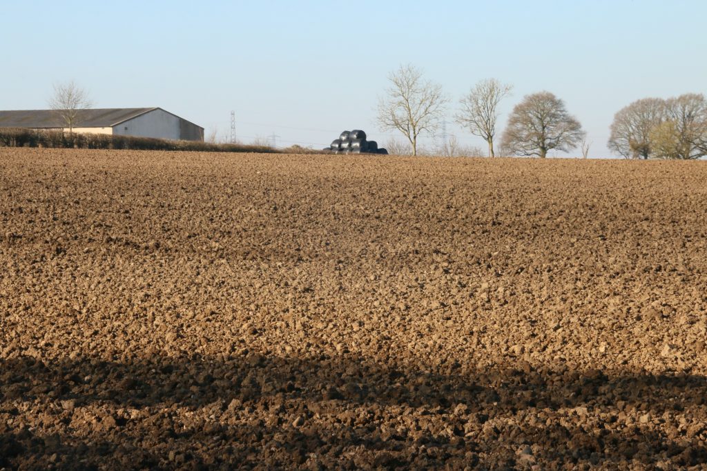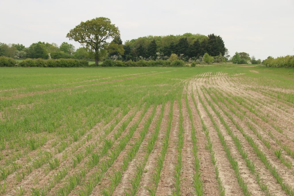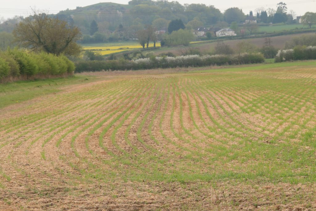 We continue across the field, over the stile, into the arable field beyond. Grass has been allowed to grow in the field over winter and into early spring, but the field was sprayed with herbicide, killing the grass and “weeds”, and then disced, breaking up the soil surface. Grass seeds brought to the surface by the discs have sprouted into lines of green. We will see what is eventually sown in this fields, and adjacent fields similarly treated.