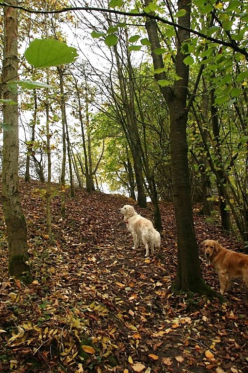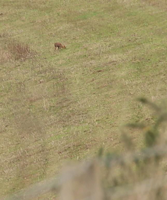 Sam was not in hot pursuit – he was still furtling around out of sight, wondering where the deer had gone. He eventually reappeared, only to pick up the scent of the fleeing muntjac and running into the trees. For a while we all called him, concerned that he might follow the scent in a direction unknown to us, worrying in the gathering dusk. He eventually reappeared from the other end of the ridge and was promptly put back on the lead.