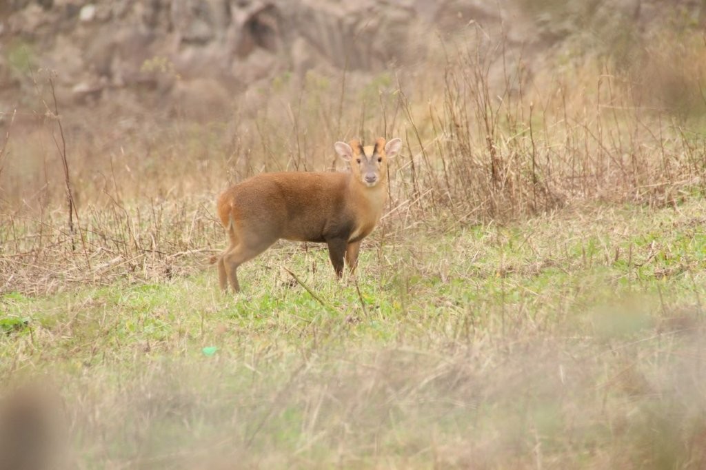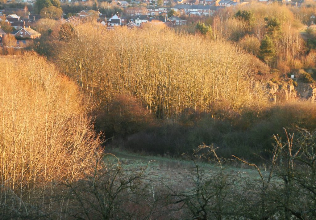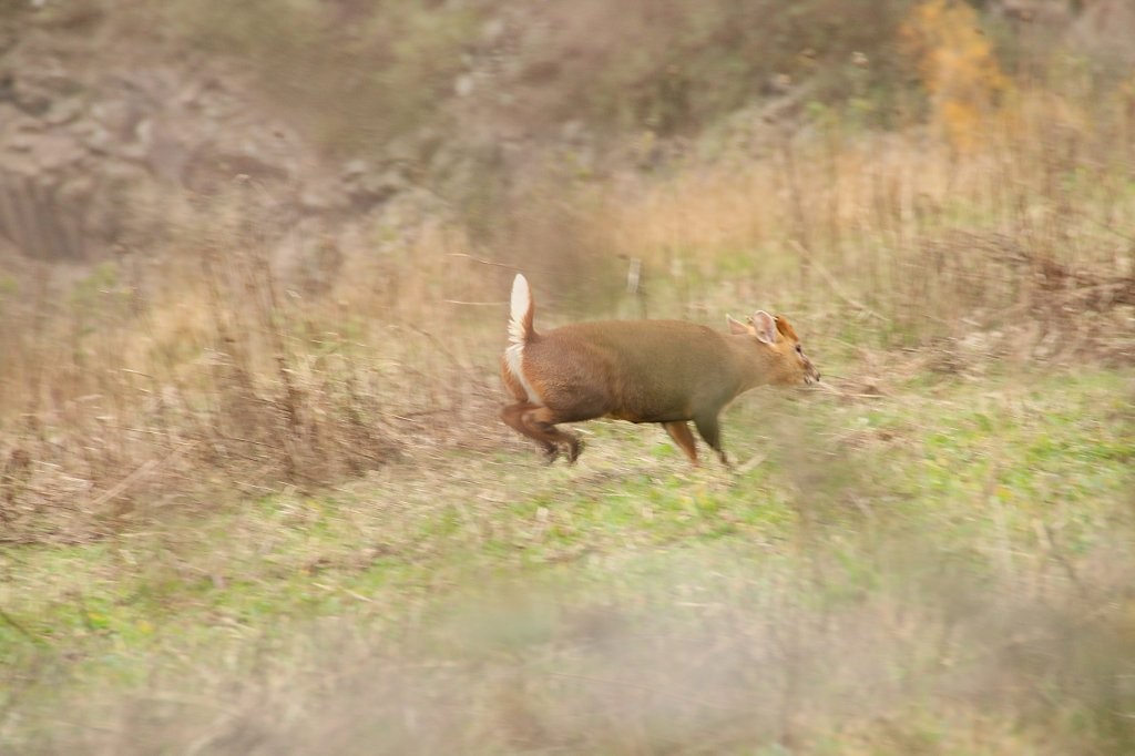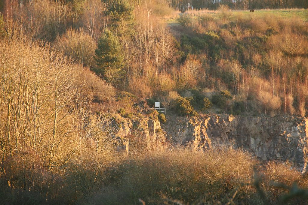 The path that hugs the edge of the quarry is bordered by a fence and then sheer drop into the quarry on one side, and on the other side by dense undergrowth descending the steep slope to the track below the ridge. Yesterday evening Sam and a friend’s dog showed great interest in the shrubs and small trees, and Sam suddenly shot off through a gap in the tangle of branches and brambles, disappearing despite me repeatedly calling. A minute later a muntjac leaped out of the shrubs just a few metres from us, its white tail flashing the late afternoon gloom, before retreating back into the trees a short distance away.