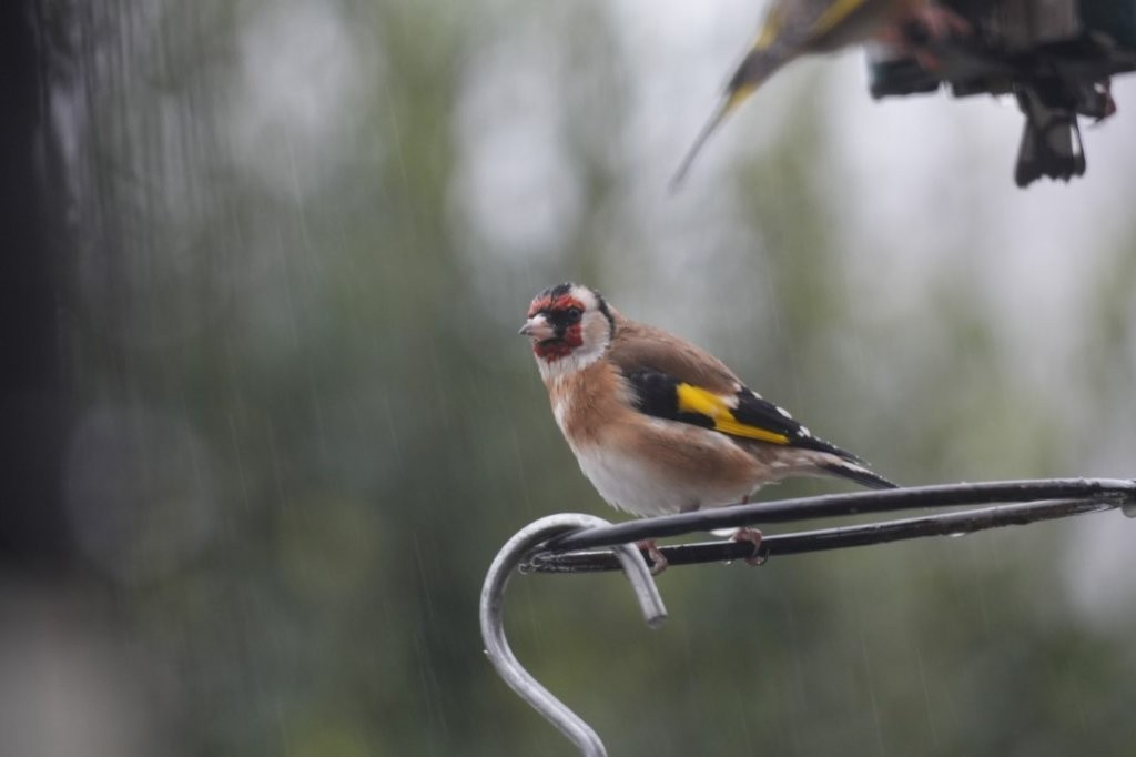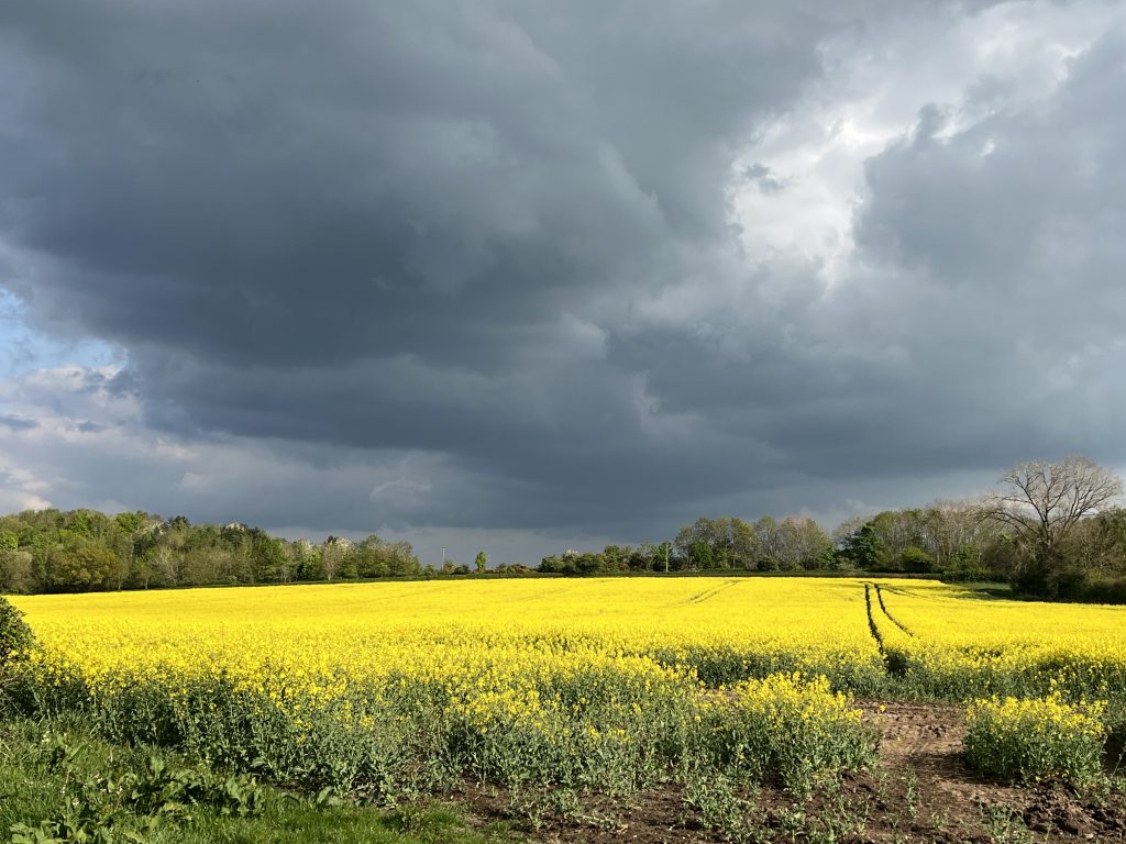 In the time taken to walk back down to the Lane and circuit the field of yellow rape flowers, dark clouds threaten, and a sharp shower of unpredictable duration. It stays dry until we are walking back up the field gate close to home, when drops of rains spot my jacket. We meet a fellow dog-walker and neighbour just setting out on her dog-walk. She wishes that she hadn’t decided to wash up before setting out.