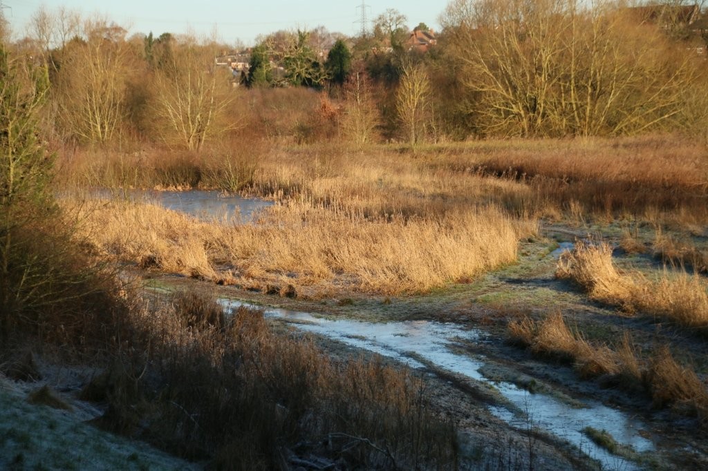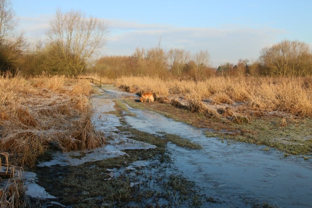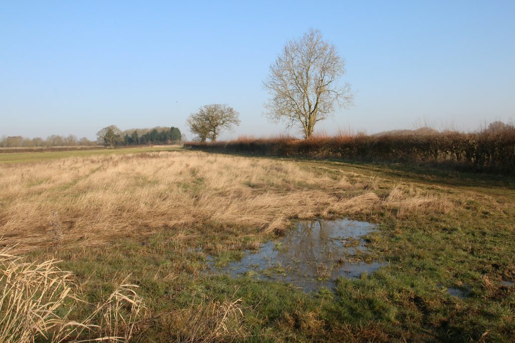 The ground is drying out nicely, although wet areas remain soggy. We cross the Sheep Field, over the stile/dog-gate and into the next field. One corner, which we cannot avoid, remains stubbornly wet. The farmer has dredged the adjacent ditch and installed a land drain from this area of the field, but water still pools. Attempts to grow crops in this part of the field have repeatedly failed, and now this area is left “wild”, just grasses, less productive, but better for wildlife.