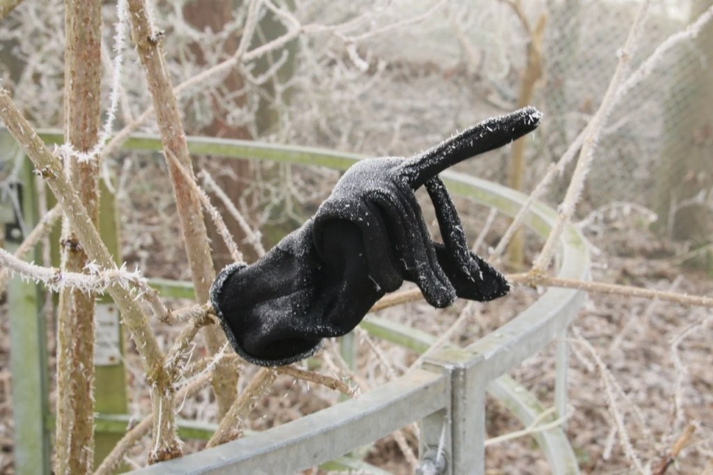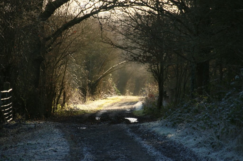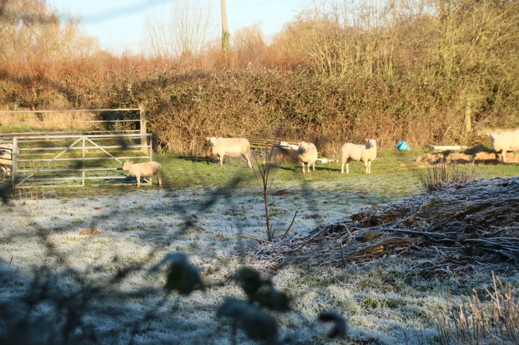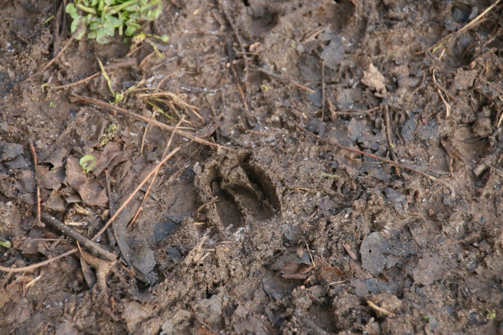 After cold damp days of thick grey cloud, this morning we wallk on frosty ground under a clear blue sunny sky. After the usual ascent of Croft Hill we follow the path to The Glebe. The path in the well-used gateway has already been churned up, no doubt by earlier dog walkers, and so after a circuit of the field, the dogs running between the Horse Chestnut trees, we leave via a less well-used gate, returning along the still-frozen path outside of the field fence, noticing the myriad of pawprints in the solid mud. Among the pawprints are several small prints of a cloven hoof – Muntjac deer are common here too.