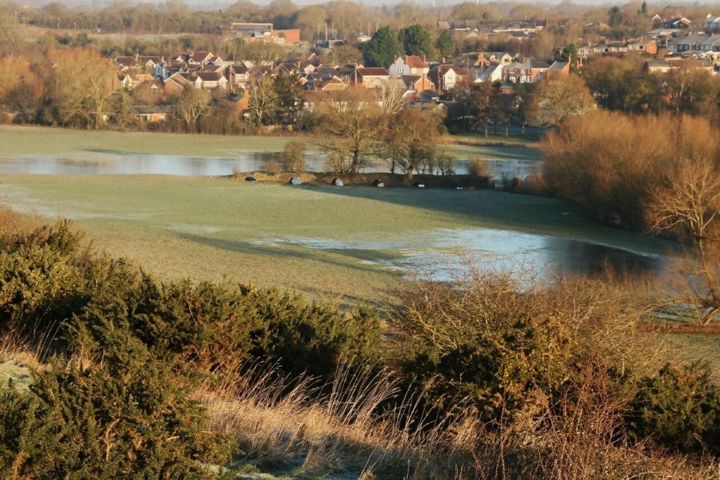 When our walks pass Croft Hill, as they do on most days, I make the effort to climb to the top without stopping, exercising heart and lungs. It is not particularly high, only 128 metres, but is significantly higher than the local countryside, and so is a popular viewpoint. Patches of gorse grow on the Hill, flowering all year round, but more so from Spring onwards than the depths of winter. Today more rain could be seen approaching from the south, and so the dogs and I beat a hasty retreat back home.