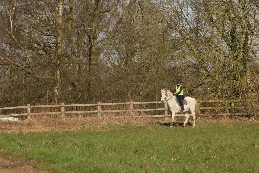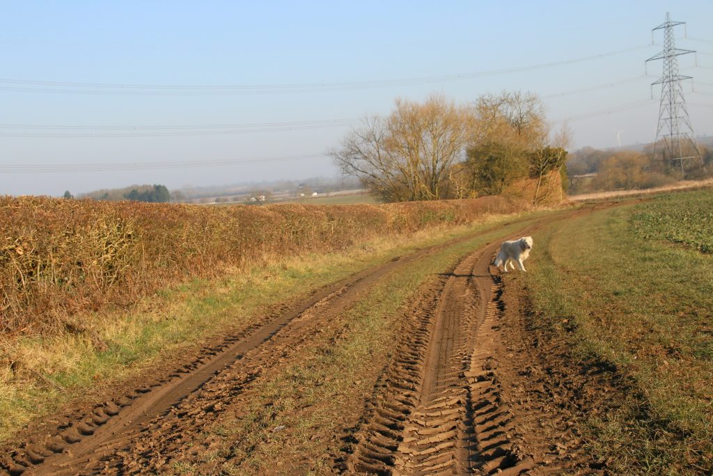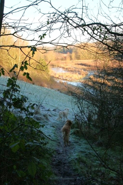The river level is noticeably lower, leaving muddy banks. The dogs hear ducks on the river long before I see them, and run through the undergrowth to the river edge, but the duck fly before they teach the water. The dogs run in vain along the riverbank as the ducks disappear over the hedge at the edge of the field. We continue into the next field, and I notice a horse rider at the far end of the track behind us – she clearly wants to canter along the track, and so I hustle the dogs along to leave the track free. Sure enough, as soon as we have turned off the track, horse and rider canter up the hill, giving us a wave as they turn in the other direction.