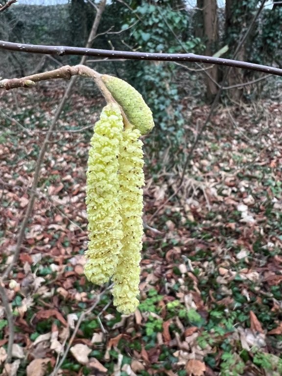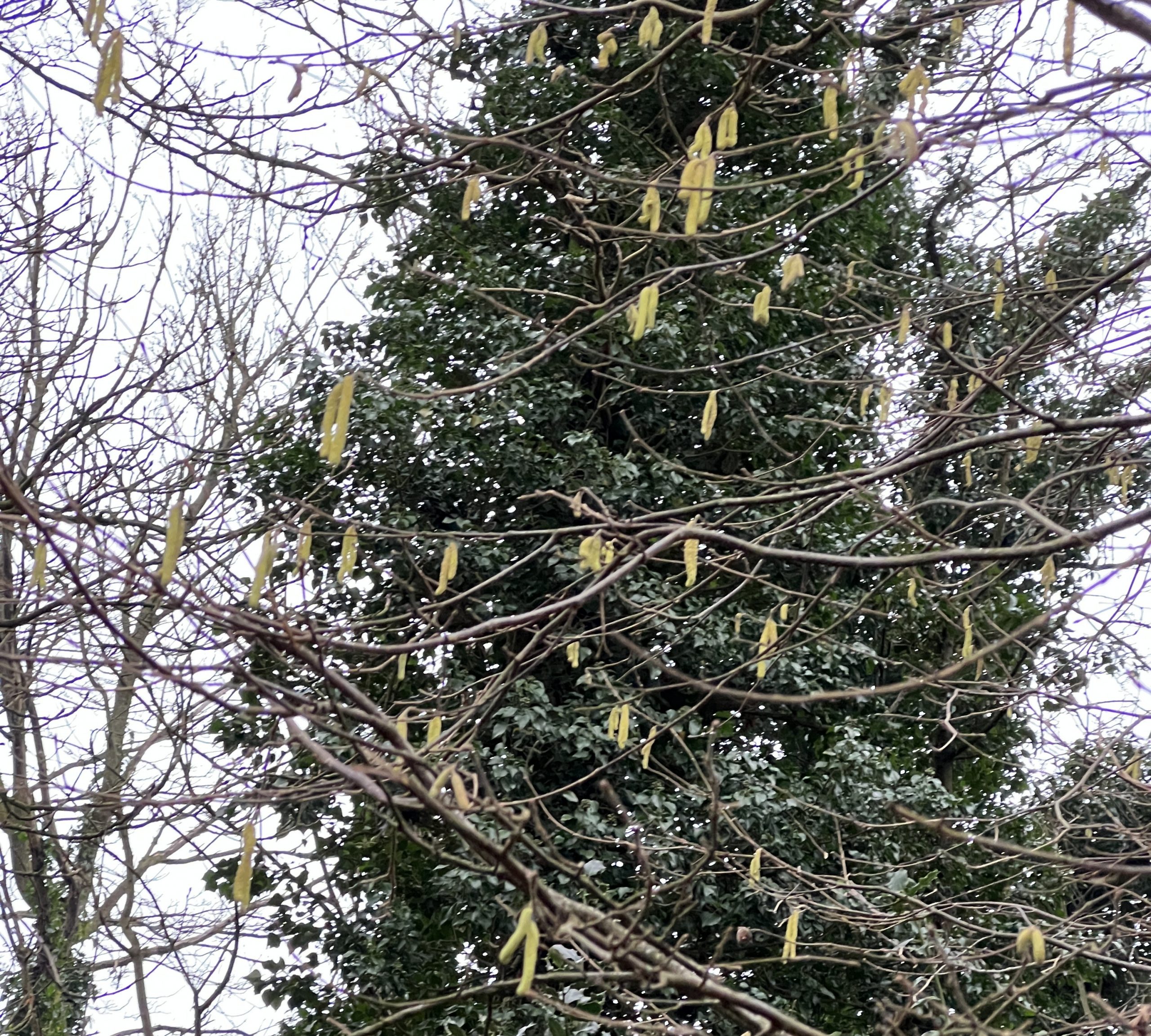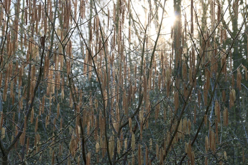 The path that leads down through trees and scrub to the gate onto the Lane that leads into Huncote is shaded by trees on one side and by the hillside rising up to the quarry edge on the other. This path receives limited sunshine, even in summer, and is one of the last paths to dry out after winters. Muddy areas traverse the path, with narrow tracks to either side where walkers have tiptoed around the edge in an attempt to keep boots clean. No blossom here, just Alder catkins cascading from bare branches.