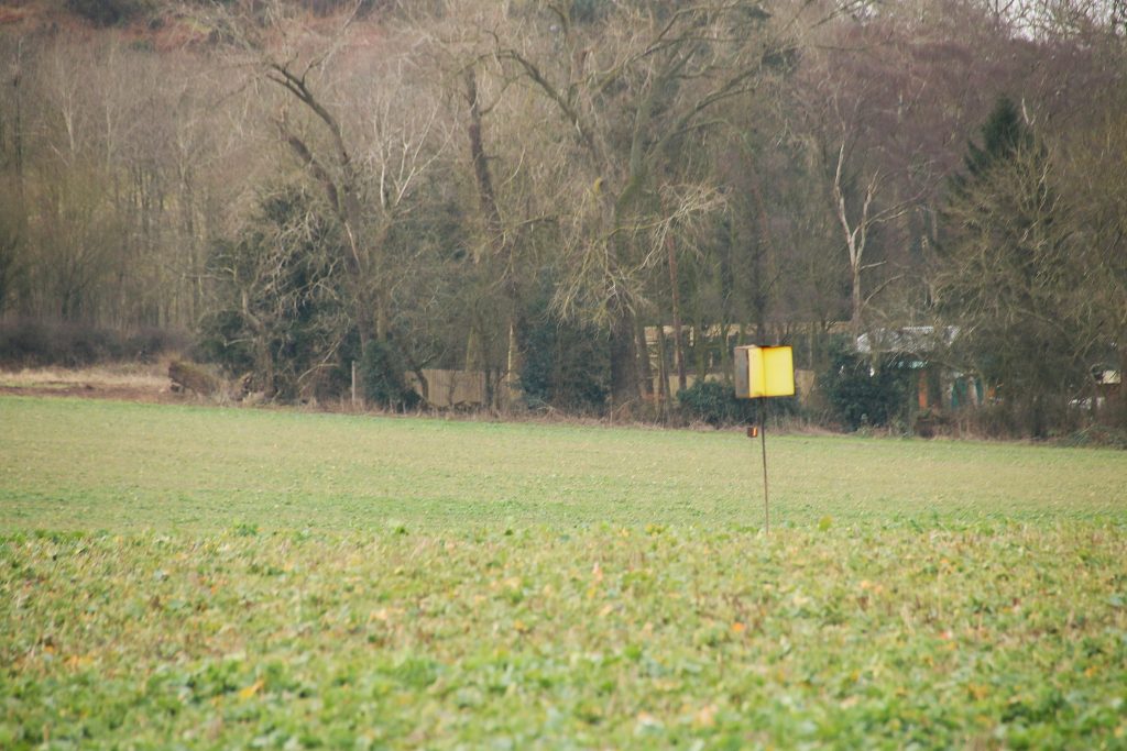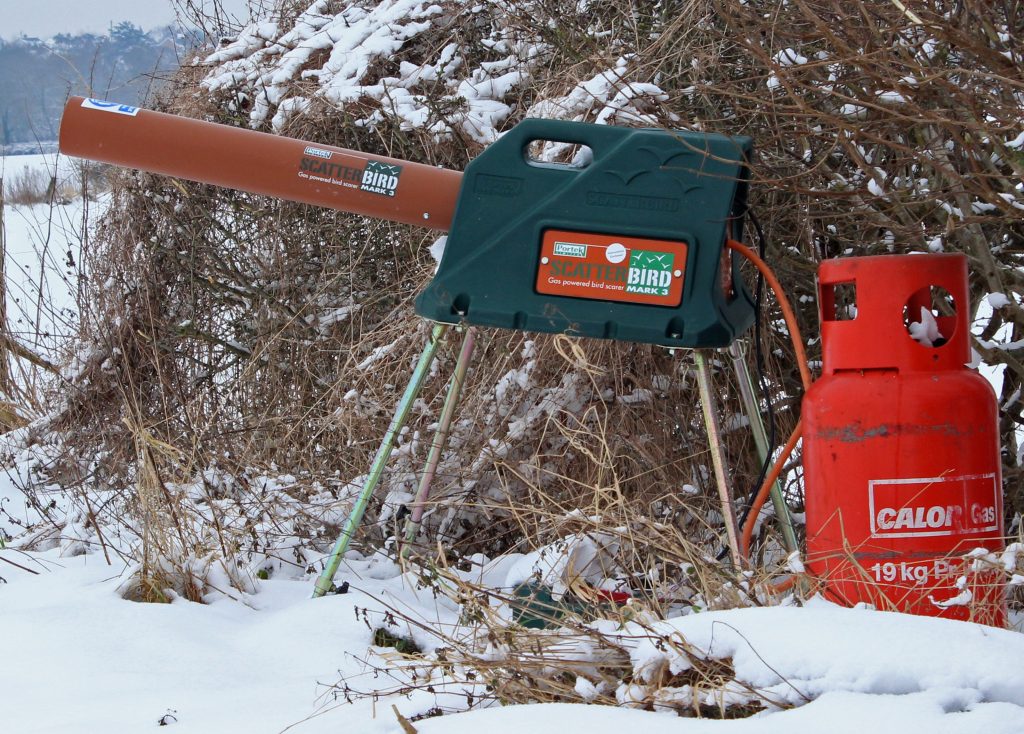 The young rape plants in the field behind us has become the favoured food of pigeons, with flocks descending to gorge on the tender leave, sufficient to reduce the eventual crop of rape seed. To deter them the farmer installed rotating “scarecrows”, wooden structures that turn in the wind, but with little effect. We now have a more effective gas-powered bird scarer installed in the hedgerow on the other side of the field behind our home. Gas from an adjacent cylinder trickles into a chamber and is ignited by a spark, the noise of the bang resulting from the mini-explosions, usually two a few seconds apart, being directed across field, causing feeding pigeons to take to the air en-masse. This photo was taken on another field edge a few years ago – approaching the scarer, with unpredictable loud bangs, is best not done too often! The frequency of the double-explosions is determined by a mechanical timer and is currently around every half hour. Thankfully the same time prevents overnight bangs, when pigeons are roosting, not feeding, and we are sleeping.