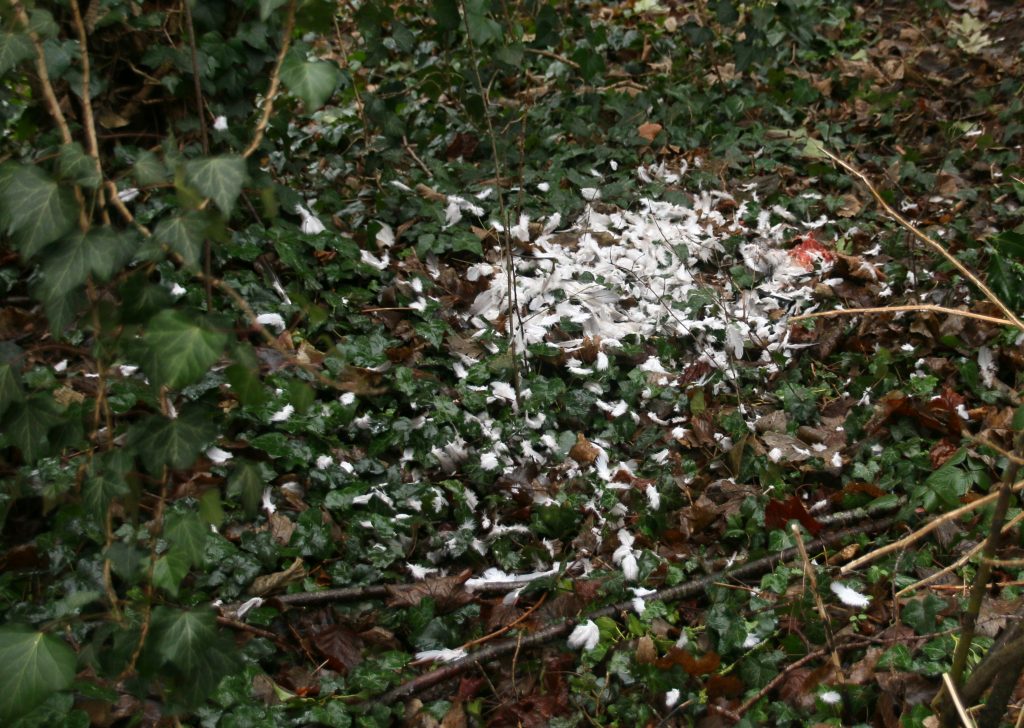 Every week, friends and I walk down the country footpath to the pub, with, between us, four dogs – obviously a dog walk that just happens to end at the pub. With no streetlights, it is a dark walk each way, and this week we followed the higher of two parallel paths, following the quarry fence, to avoid the worst of the mud. One friend has lurcher, always on a lead, who suddenly and unexpectedly launched herself vertically, barking excitedly, as my mate hung on to her lead. In the light of his headtorch he spotted a fox running along the other side of the chain-link fence – the rest of us just spotted a pair of eyes reflected in the light from our torches. Walking the same path in daylight I spot tracks through the undergrowth, leading to gaps beneath the fence, clearly a fox highway. Further along the footpath a patch of feathers reveals where a pigeon had come to an untimely end when the fox had pounced and caught its supper.