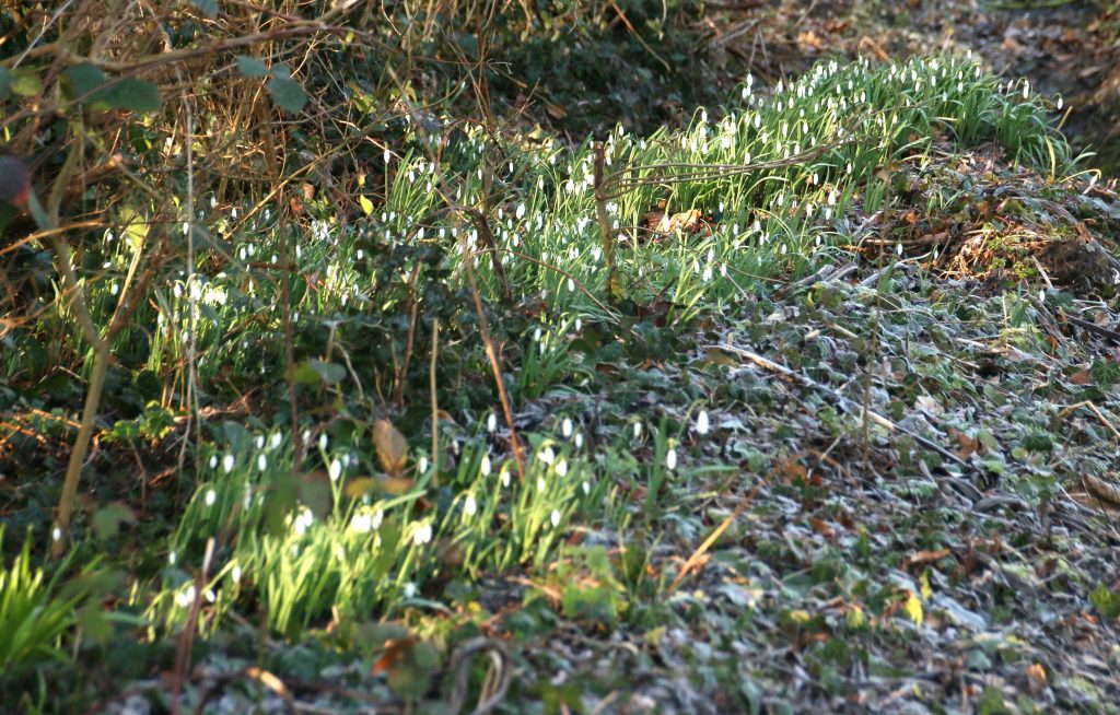 Its not all bad news though. Along the verge on the other side of the Lane the snowdrops have been a particularly spectacular display this year and have now been followed by an early display of daffodils. In the countryside blackthorn hedgerows are already starting to blossom, the flowers that by late Summer will be producing sloes, the dark bitter berries that we will pick to flavour gin, which will be the matured Sloe Gin ready to accompany Christmas dinner. The experts and Kew tell us that some fruit trees need a few frosts to encourage blossom and fruit, and that the mild weather may mean fewer apples this year. Hopefully it wont have the same effect on blackthorn, and there will be enough sloes to be shared between those making slow gin, and the birds fattening up for winter.