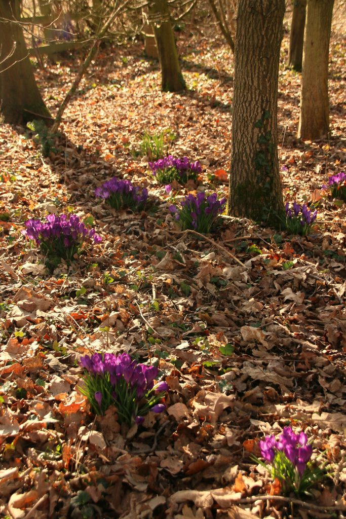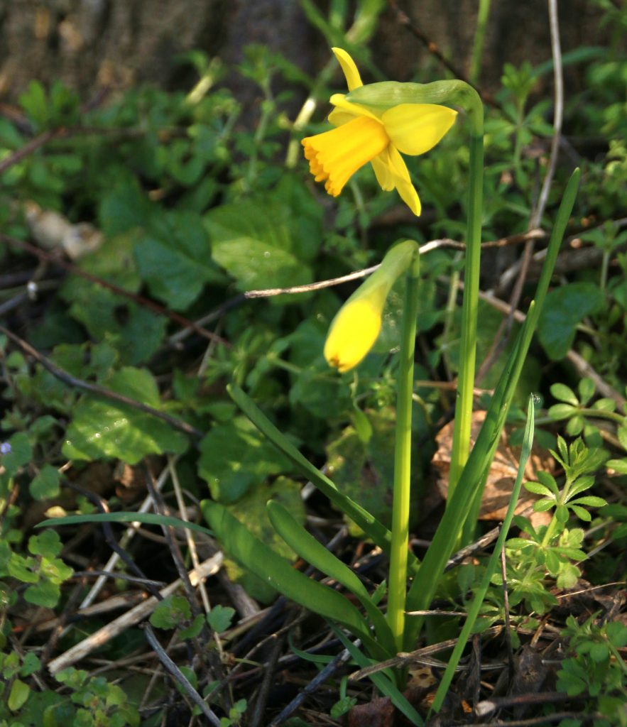 Despite warm sunshine during the day, nature seems to be on hold – nights are still cold, and the ground frosty during our morning walks. Leaf buds appeared on branches two to three weeks ago, but the only leaves that have emerged are on elder shrubs. Shoots of wildflowers and other plants are emerging from the ground but are still only a few cm high. The exceptions are flowers that are more traditional cultivated than native – crocuses have been in bloom for a few weeks, and daffodils are coming into flower on roadside verges and amongst the trees on the edge of the Glebe.