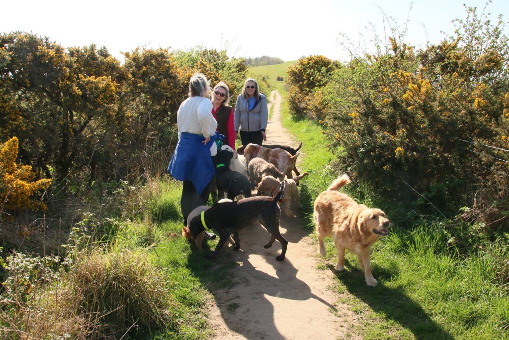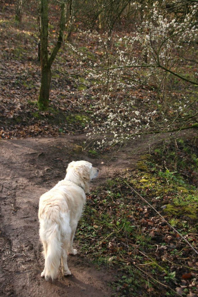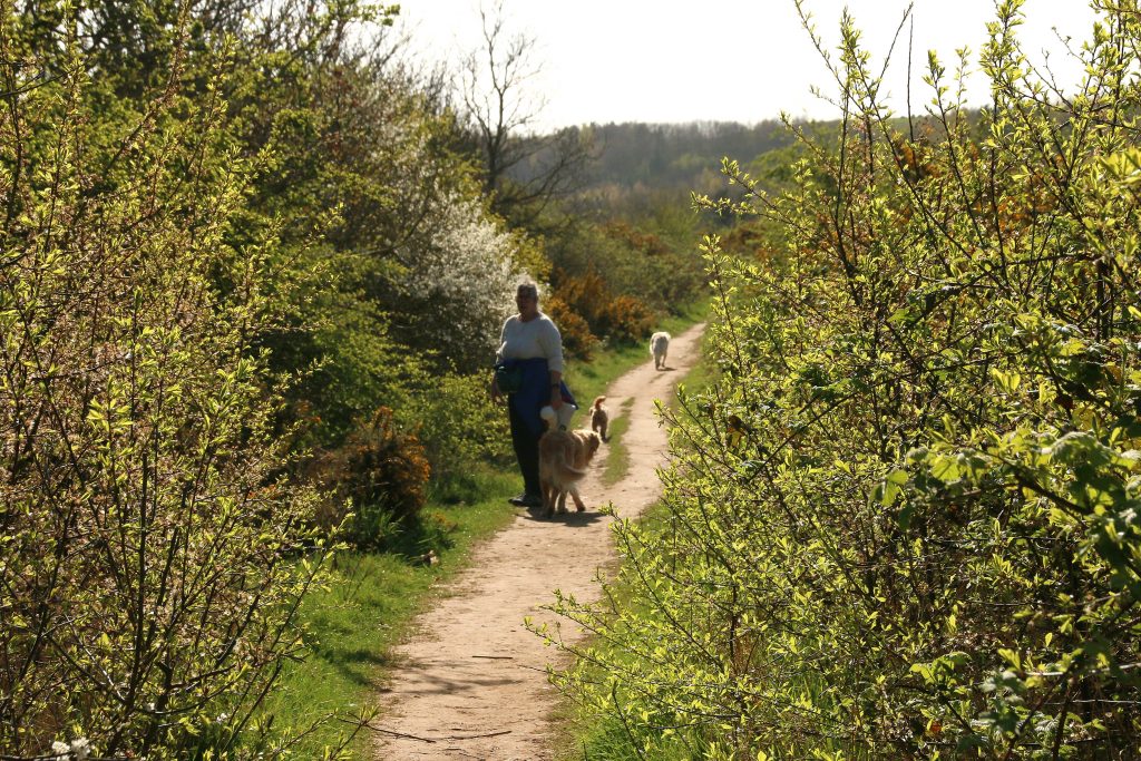 It is a lovely sunny spring morning, mild in spots sheltered from the brisk breeze, and in consequence the paths around the quarry are quite busy. We meet a friend with her “pack” of hounds, all well behaved, which she breeds, accompanied by cockapoo Freddie. We have two additions to the family – a couple of cockapoos which we are “dog sitting” for a week, quite a lot of dogs crowded on a narrow track. Both and dogs and owners all exchange greetings before we go our separate ways. We meet more walkers, dog walkers, bird watchers with binoculars, and some people just out for a stroll, and after turning around and walking back down the hill we meet a couple and their cockapoo. We have to admit that, although cockapoos can be cute, on the whole we prefer Golden Retrievers.