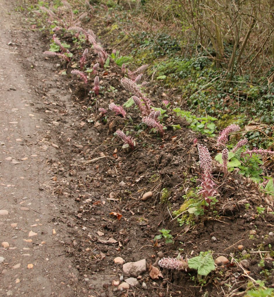 The footpath from The Glebe to the hamlet of Potters Marston follows, for the first few hundred metres, a narrow private road, gravelled and potholed, drained by an adjacent ditch. The ditch was dredged last year, leaving a damp mound of silt following the line of the ditch, burying the established wild rhubarb growing at the edge of the ditch. Reinvigorated by the nutrient-rich silt, the rhubarb has emerged through the mound to display its large purple flowers.