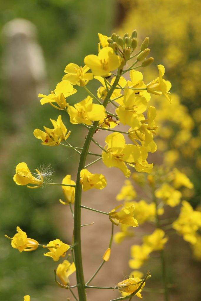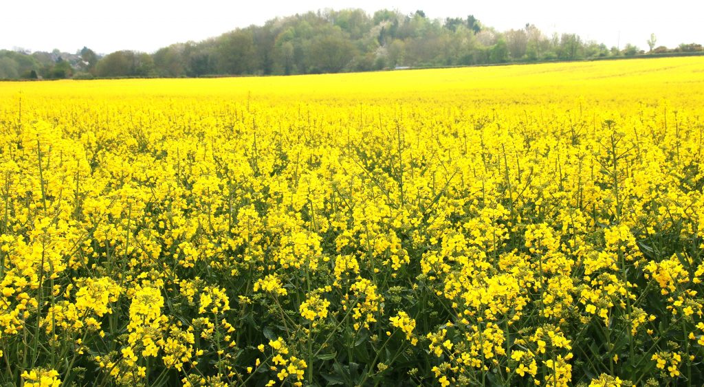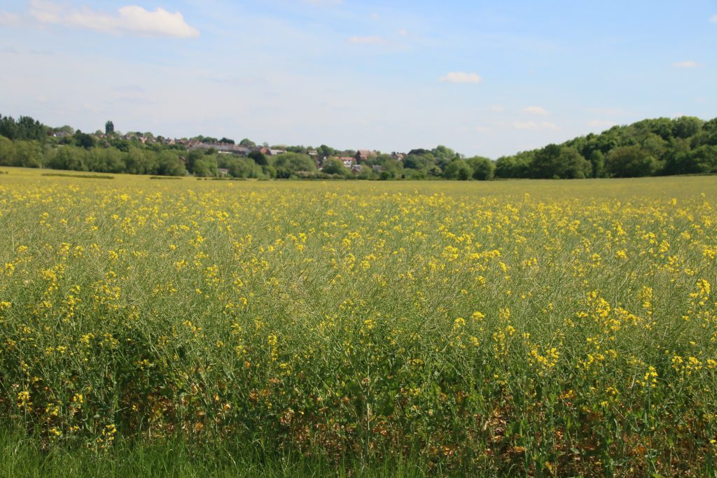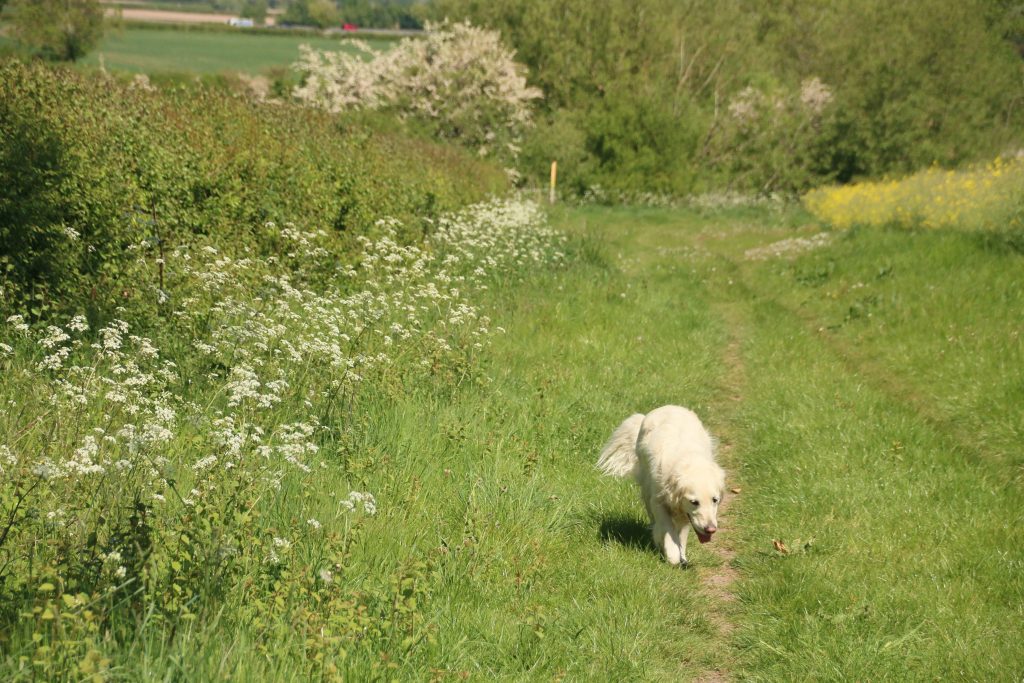 We walk back down the field towards home. The cereal crop sown a couple of months ago has grown, but soil is dry in the gaps between rows. It is only early May, with plenty of time for rain to encourage more productive growth. In contrast the rape in the field close to our Lane is thriving, still in full flower, the large leaves still tempting for the dogs to chew if we don’t stop them in time – the field is periodically sprayed with pesticide and herbicide, which, although technically harmless to dogs, are chemicals that they should avoid.