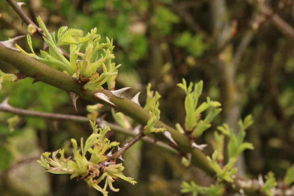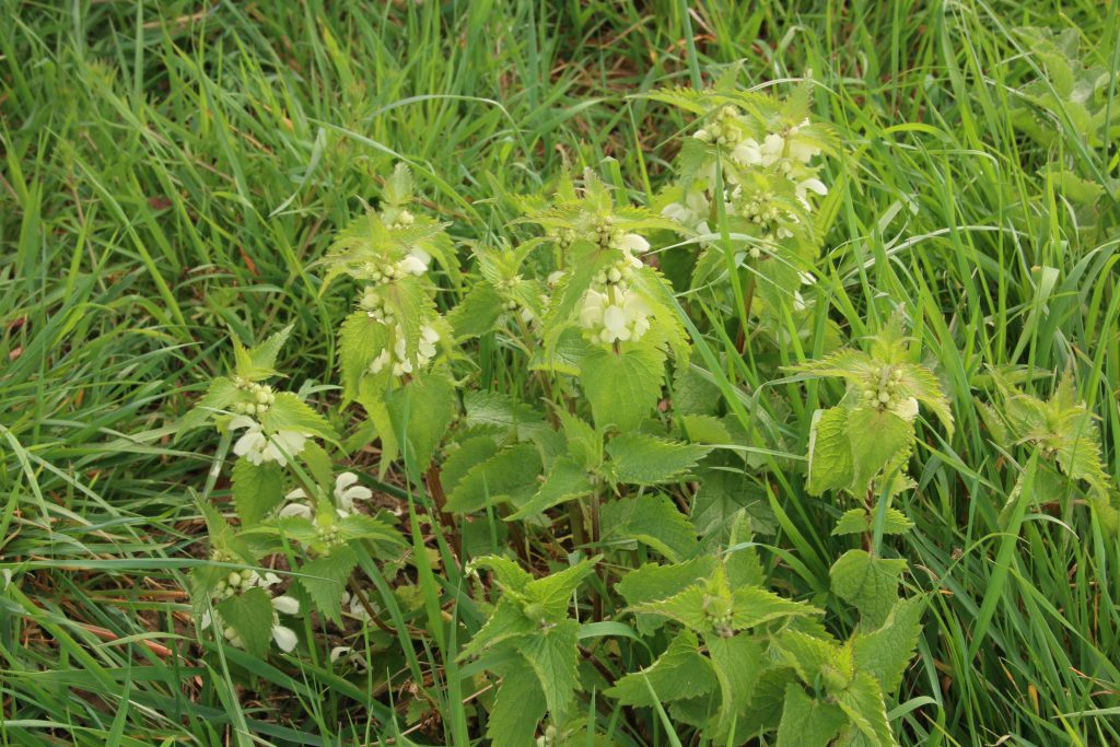 After a circuit of footpaths, I walk back down the path that returns us to the sheep field. An arch of thorns reaches out to trap the unwary, a leggy branch of wild Dog Rose just coming into leaf. At our feet White Dead Nettle is flowering, white flowers on a low plant, looking similar to stinging nettles, but these leaves don’t sting. This common plant flowers for most of the year.