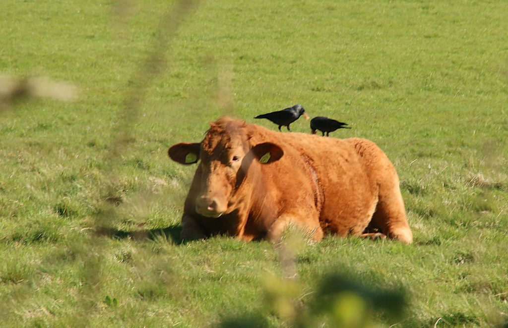 Yesterday, Easter Sunday, I was out and about on the footpaths around the quarry bright and early – well, by 8.30am, early for us. It was a fine morning, and already the paths were busy, not just dog walkers, but also families and couples out for a stroll, and mountain bikers, courteously slowing down and greeting the dogs. The field adjacent to the wide track leading back to the Lane has, at various times, both cows and sheep in occupation, sometimes simultaneously. I note a cow lying down, which according to folklore suggests impending rain, and on this occasion the Met Office agrees. Crows perch on its back, feeding on grubs and insects, and possible removing loose hair for nesting, do doubt all to the relief of the passive bovine.