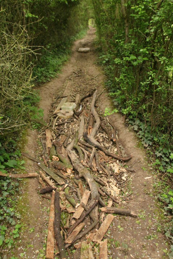 This morning, Bank Holiday Monday, we were again out early, this time to avoid rain due to arrive mid-morning. We used the less popular field paths from the gate further down the Lane. It was peaceful, no-one else on the paths, no traffic on the Lane. Despite a few showers, the ground remains dry, and I opted for a longer route that includes bridleways, used by local horse riders and almost impassable after wet weather. The paths were dry, and in the most part level, but in places that have been particularly wet the now-dry ruts and potholes are ankle-breakingly deep and must be trodden with care. One path, between hedges, is not a bridleway, but has been churned up by walkers and mountain bikers, and regulars have attempted to keep it passable using wood and branches, now cemented into the dry mud.