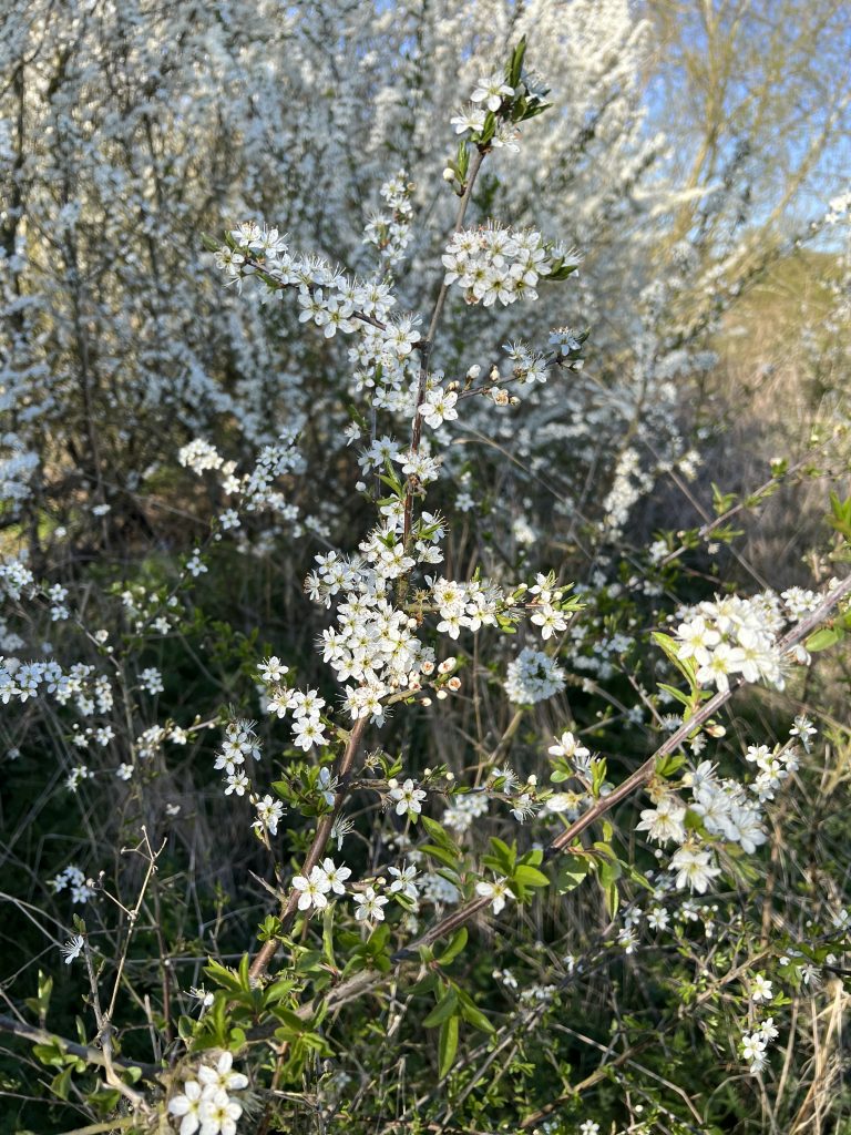 Gorse flowers all year but becomes more vigorous as days lengthen and the weather warms, an early source of nectar for insects. Similarly, the blossom on the Wild Cherry shrubs, that has been on display for two to three weeks, seems to have become invigorated, as more flowers have opened, now a dense white display against bare branches.